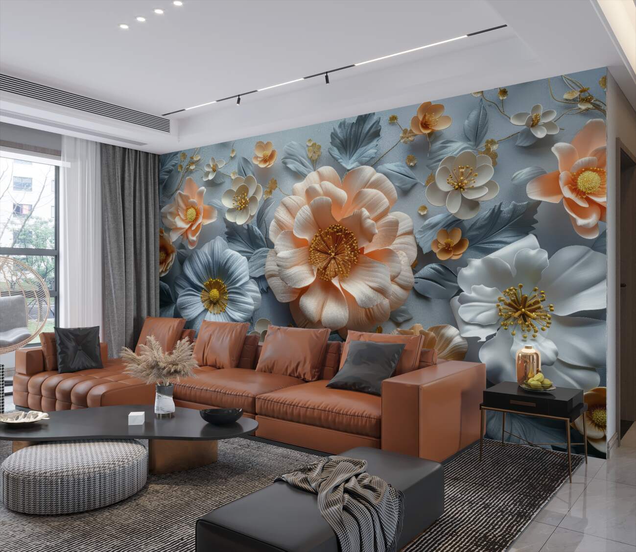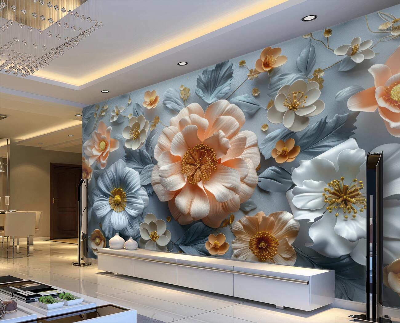 Fototapeta 3D obszerne kwiaty na niebieskim tle