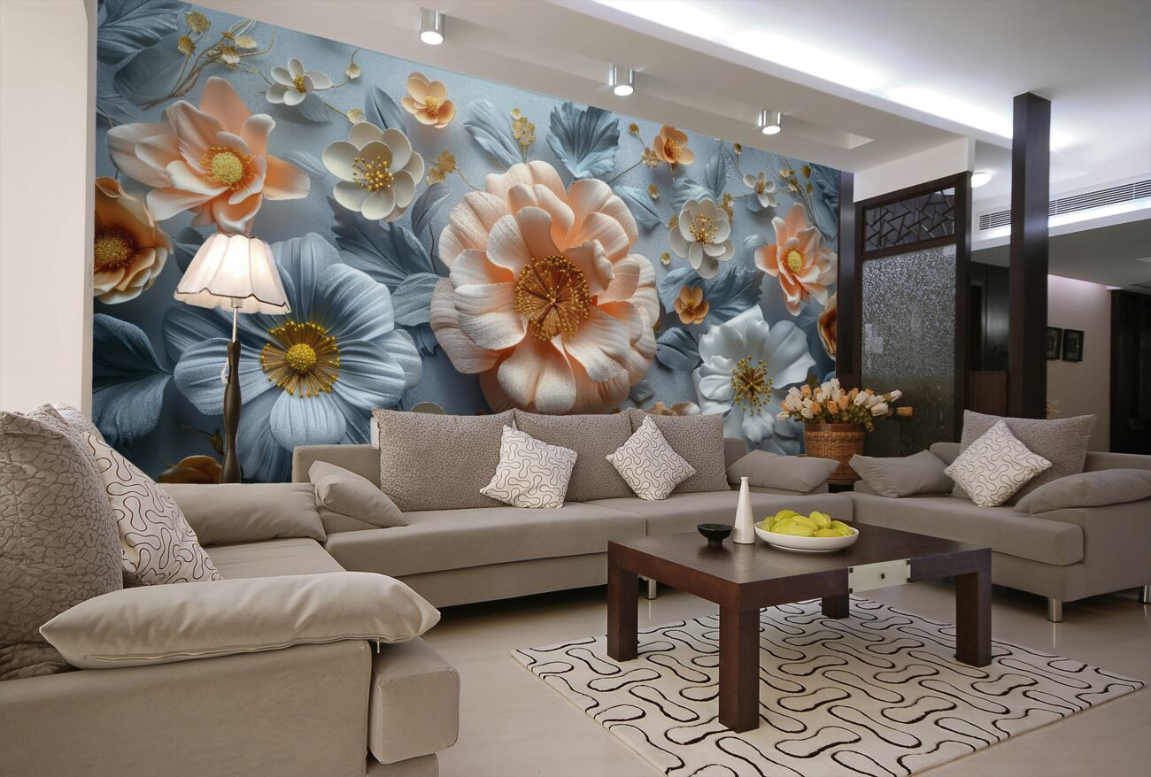 Tapeta Fototapeta 3D obszerne kwiaty na niebieskim tle (artykuł u14070 ) z kategorii Fototapety 3D