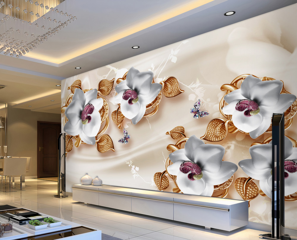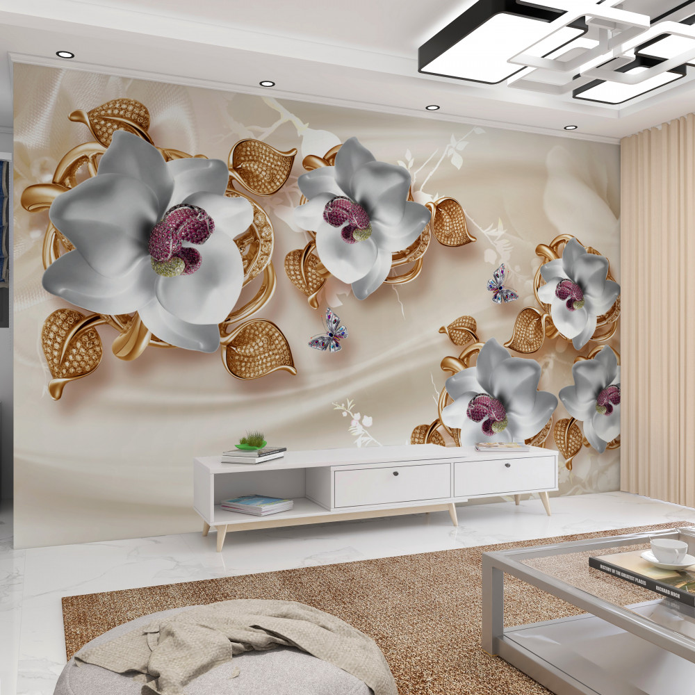 Tapeta Fototapeta biała orchidea ze złotymi liśćmi (artykuł a91057 ) z kategorii Fototapety 3D