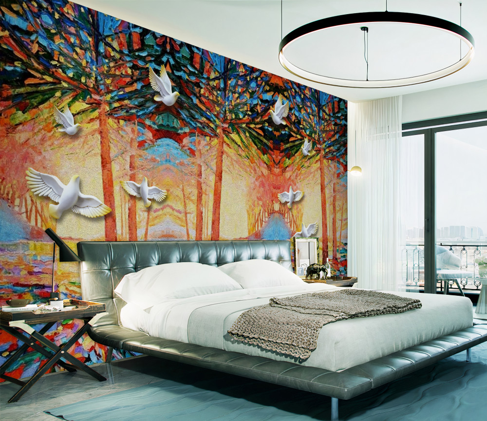 Tapeta Fototapeta białe gołębie na stawie o zachodzie słońca (artykuł pb10009 ) z kategorii Fototapety 3D