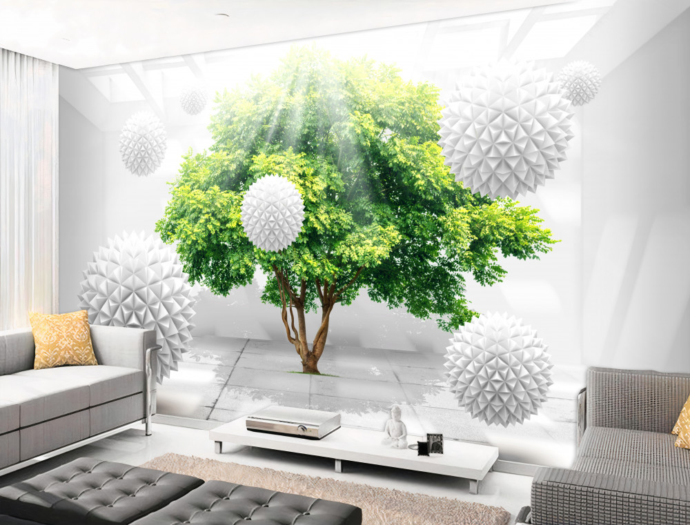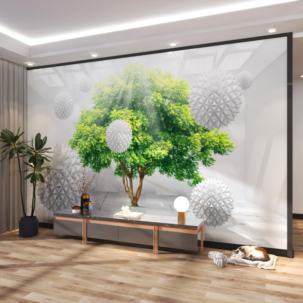Tapeta Fototapeta białe kulki na zielonym drewnianym tle z promieniami słońca (artykuł a90927 ) z kategorii Fototapety 3D