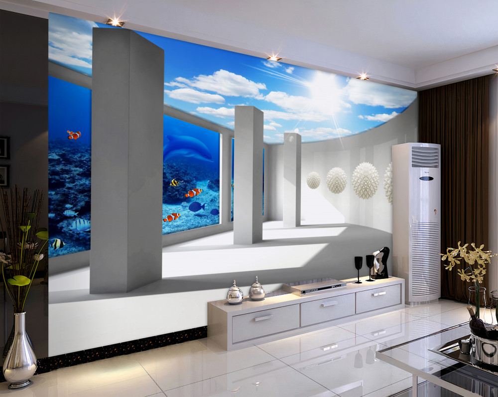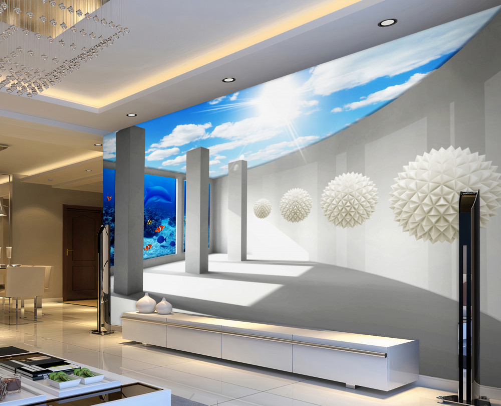 Tapeta Fototapeta białe kulki obracają się wokół akwarium na niebie (artykuł a90364 ) z kategorii Fototapety 3D