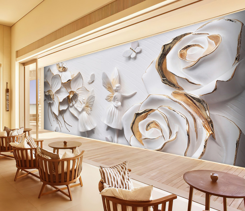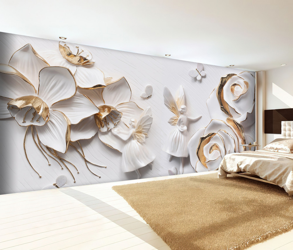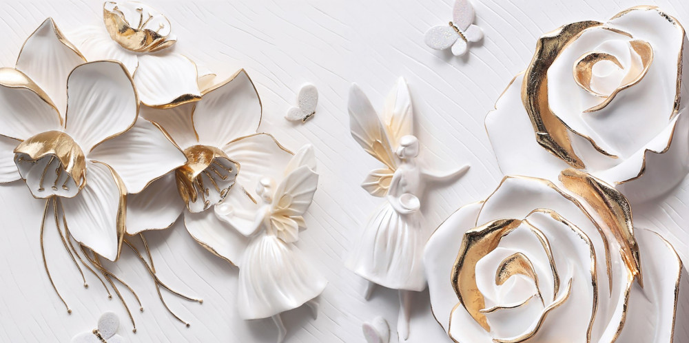 Tapeta Fototapeta białe kwiaty ze złotem i motylami (artykuł a89984 ) z kategorii Fototapety 3D