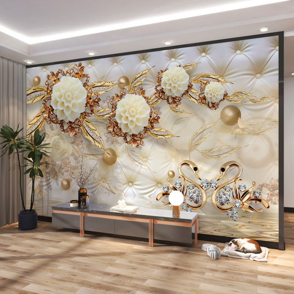 Tapeta Fototapeta białe kwiaty ze złotymi gałęziami i łabędziami na wodzie (artykuł a89997 ) z kategorii Fototapety 3D