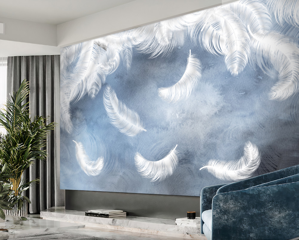 Tapeta Fototapeta białe latające pióra na niebieskim tle (artykuł a90167 ) z kategorii Fototapety 3D