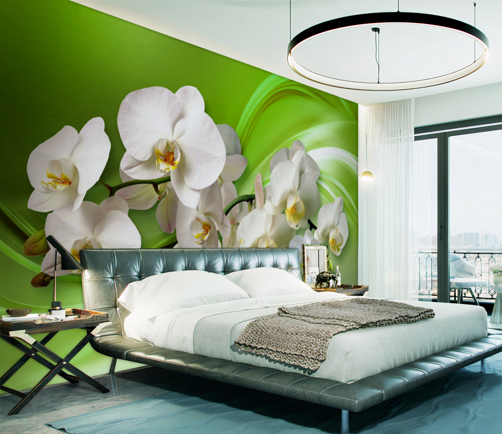 Tapeta Fototapeta białe orchidee na gałęzi na zielonym tle (artykuł a89267 ) z kategorii Fototapety 3D