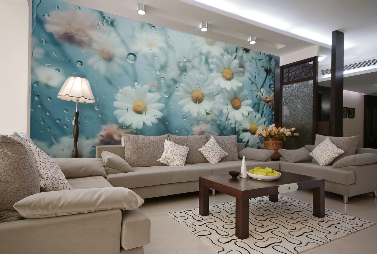 Tapeta Fototapeta Białe stokrotki w deszczu (artykuł u11012 ) z kategorii Fototapety 3D