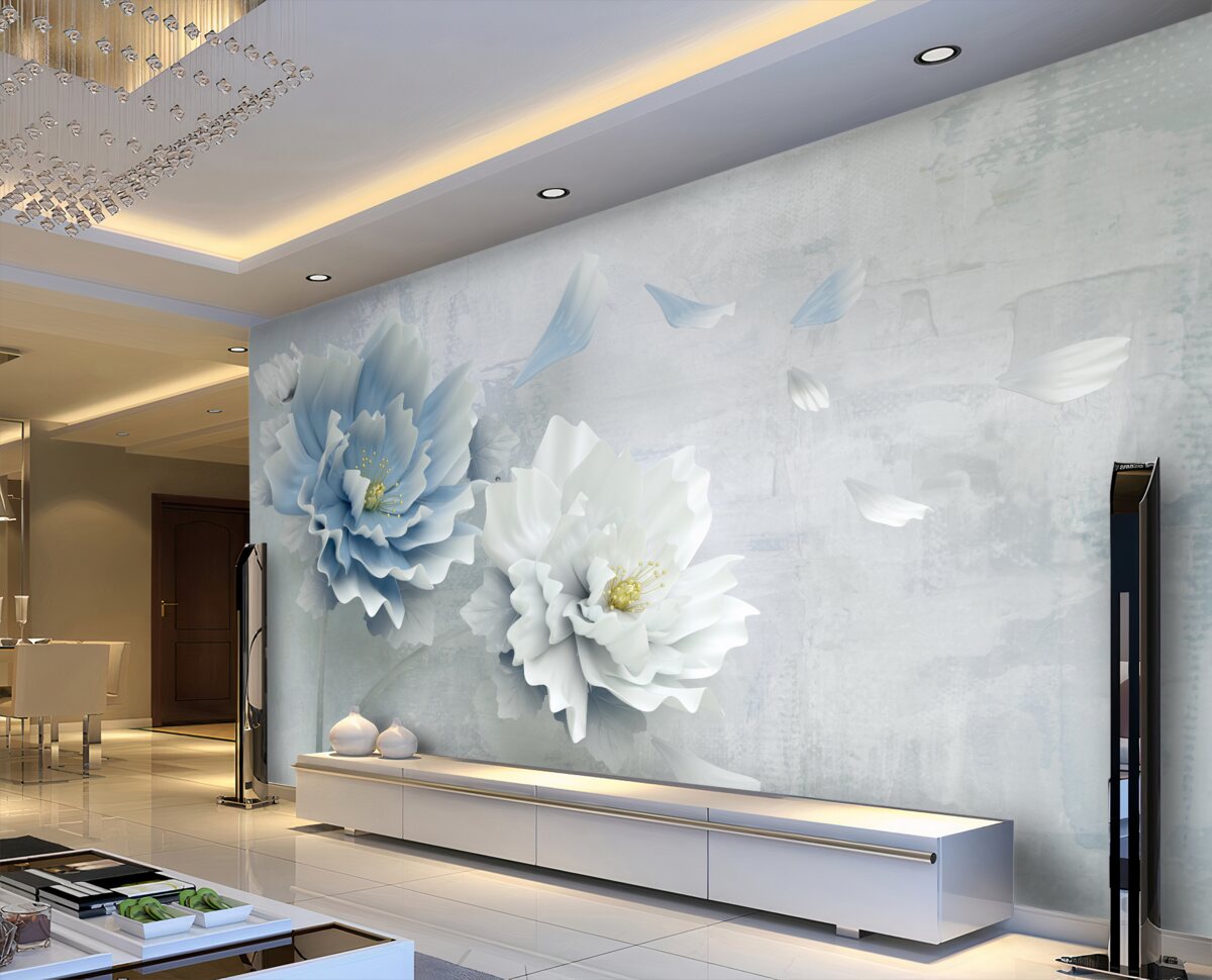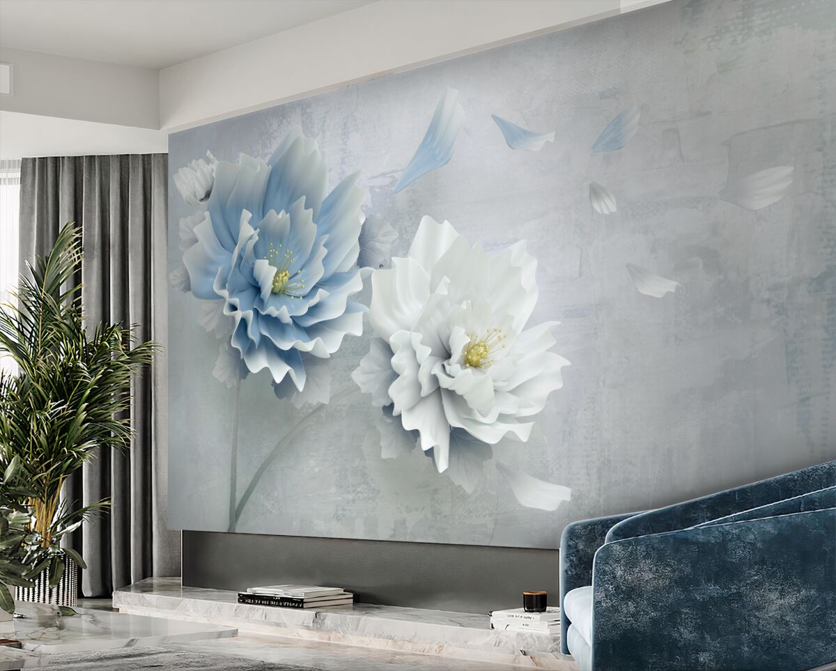 Tapeta Fototapeta biały i niebieski kwiat na tle abstrakcji górskiej (artykuł a94209 ) z kategorii Fototapety 3D