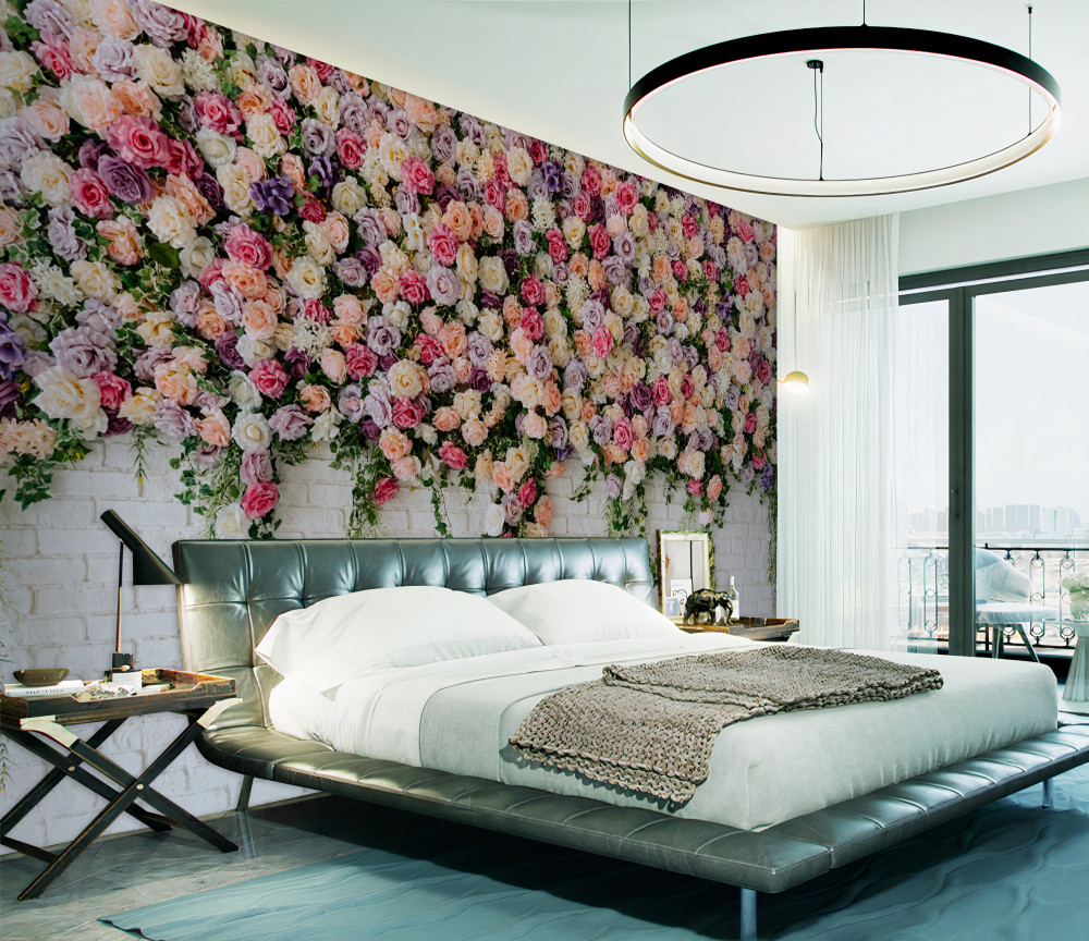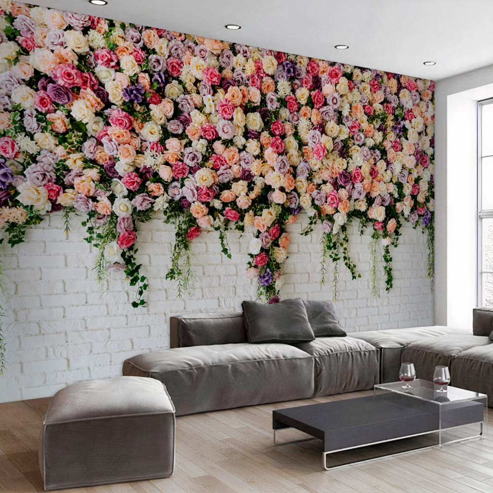 Tapeta Fototapeta ceglany mur posypany sprayowymi kwiatami róż (artykuł a93188 ) z kategorii Fototapety 3D
