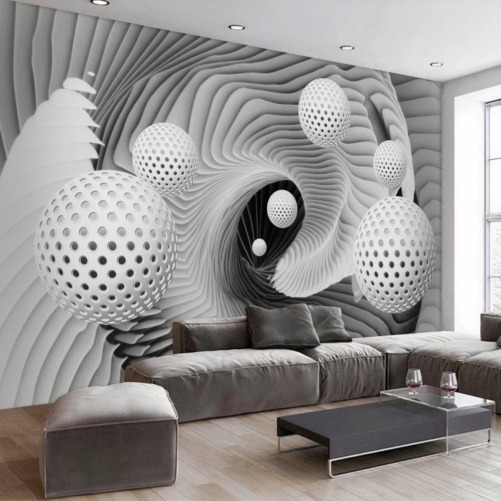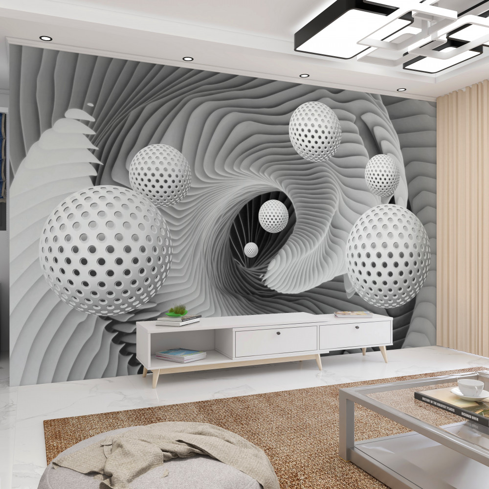 Tapeta Fototapeta czarno-biała perspektywa kulek i wiru tunelowego (artykuł a91400 ) z kategorii Fototapety 3D