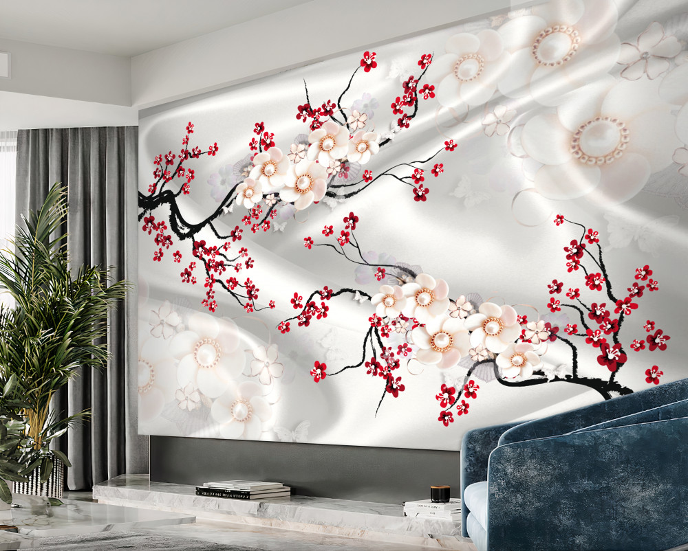 Tapeta Fototapeta czerwone gałęzie sakury z kwitnącymi kwiatami (artykuł a91176 ) z kategorii Fototapety 3D