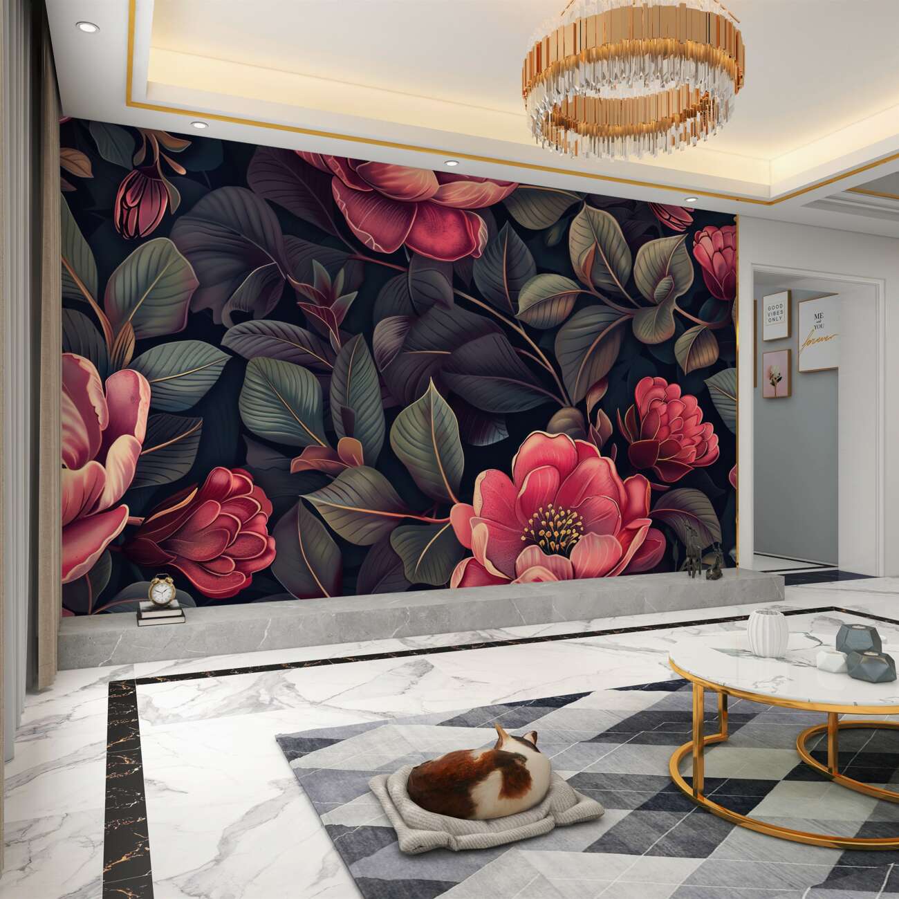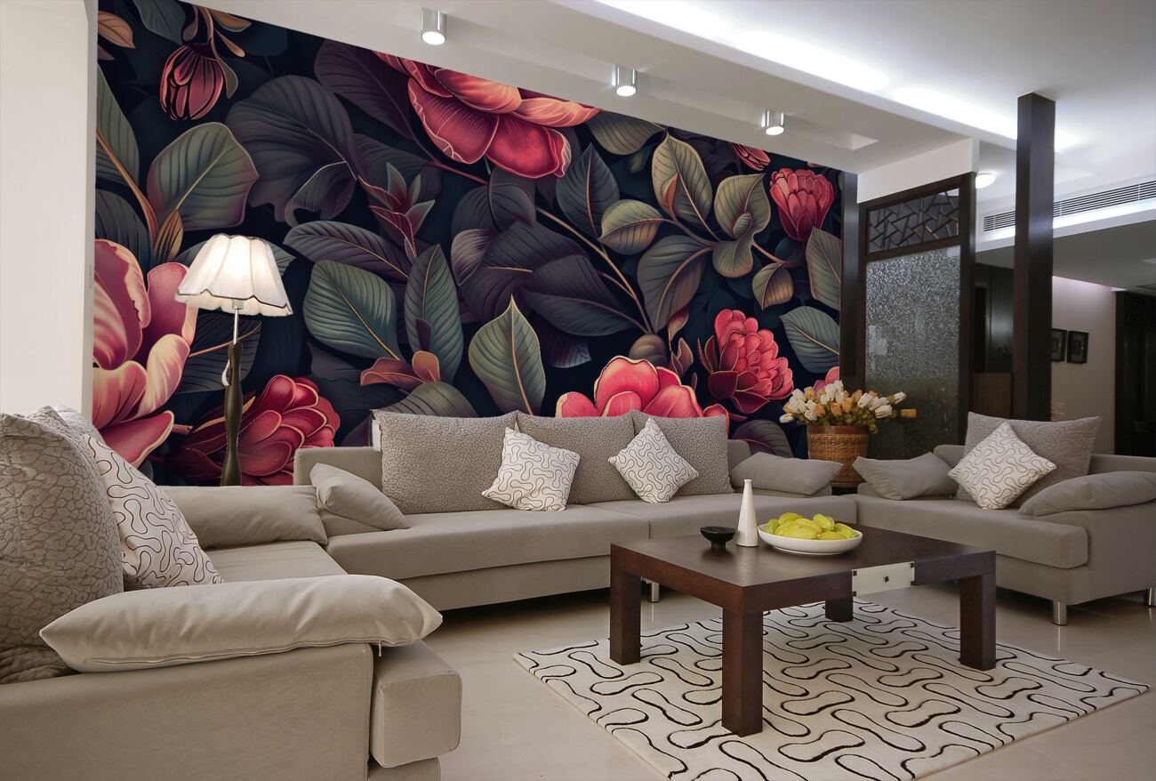 Tapeta Fototapeta Czerwone kwiaty na zielonych liściach (artykuł u10966 ) z kategorii Fototapety 3D