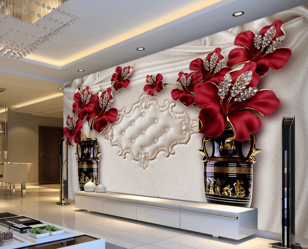 Tapeta Fototapeta czerwone lilie w czarnych wazonach (artykuł a93815 ) z kategorii Fototapety 3D
