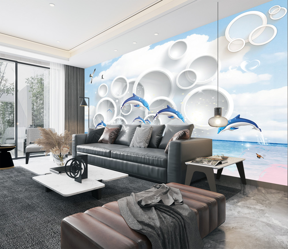 Tapeta Fototapeta delfiny skaczące nad wodą i abstrakcyjne pierścienie (artykuł a94113 ) z kategorii Fototapety 3D