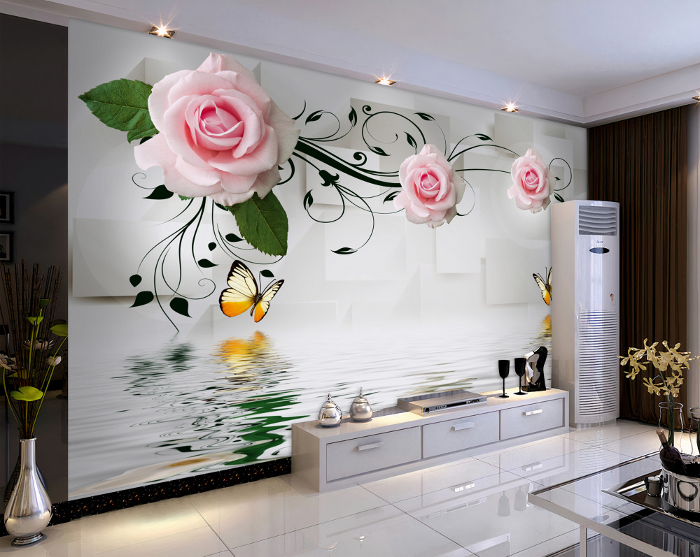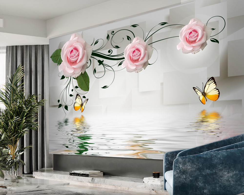 Tapeta Fototapeta delikatna różowa gałąź róży nad wodą z motylami (artykuł a94295 ) z kategorii Fototapety 3D