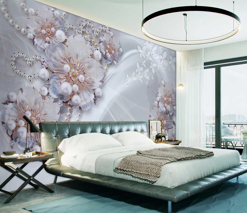 Tapeta Fototapeta delikatne kwiaty z perłami na jedwabiu (artykuł a91227 ) z kategorii Fototapety 3D