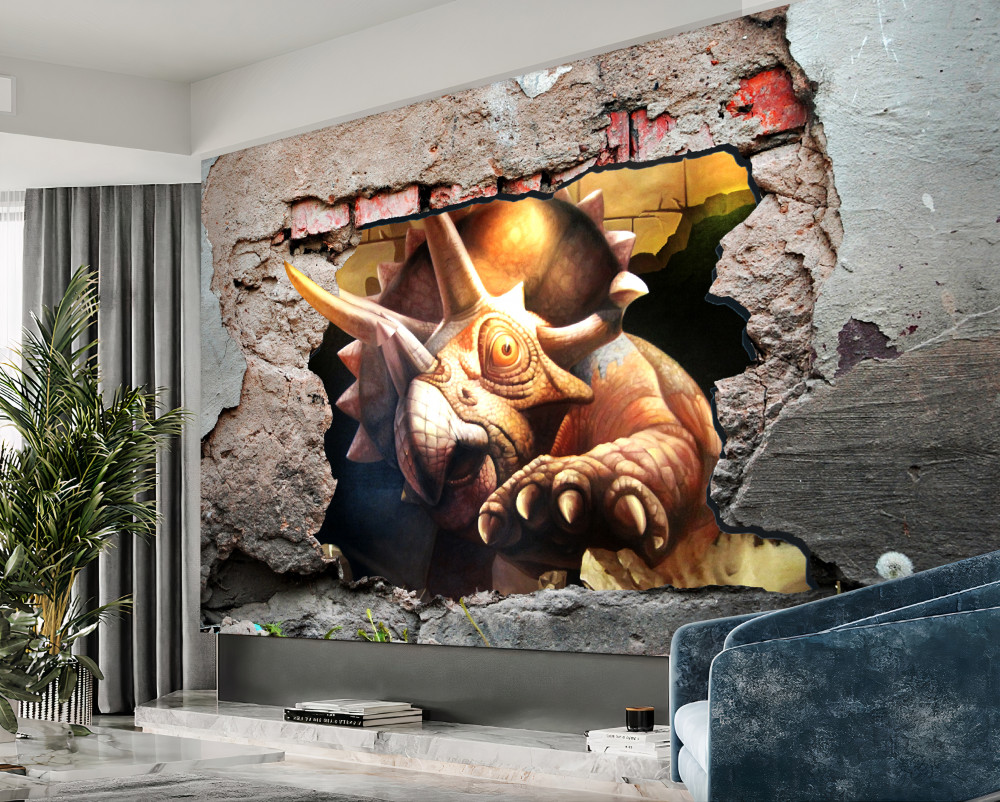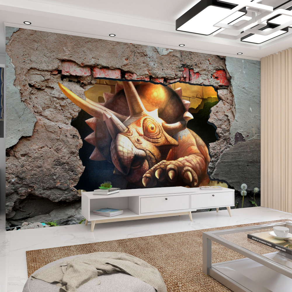 Tapeta Fototapeta dinozaur niszczy kamienną ścianę (artykuł pb8926 ) z kategorii Fototapety 3D