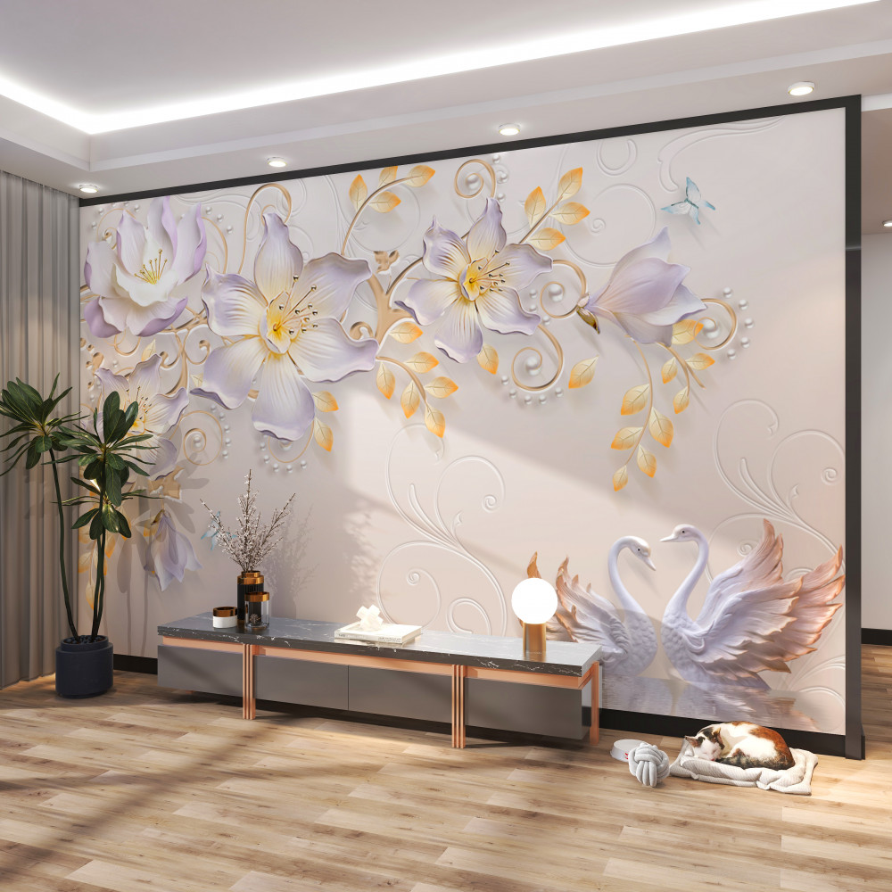 Tapeta Fototapeta dwa białe łabędzie i białe kwiaty (artykuł a90146 ) z kategorii Fototapety 3D