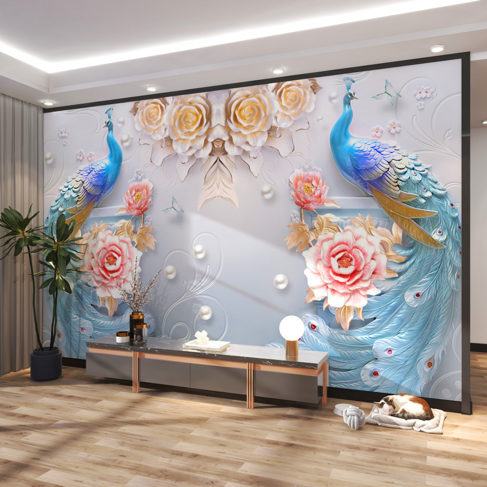Tapeta Fototapeta dwa wspaniałe pawie i różowe róże (artykuł a90226 ) z kategorii Fototapety 3D