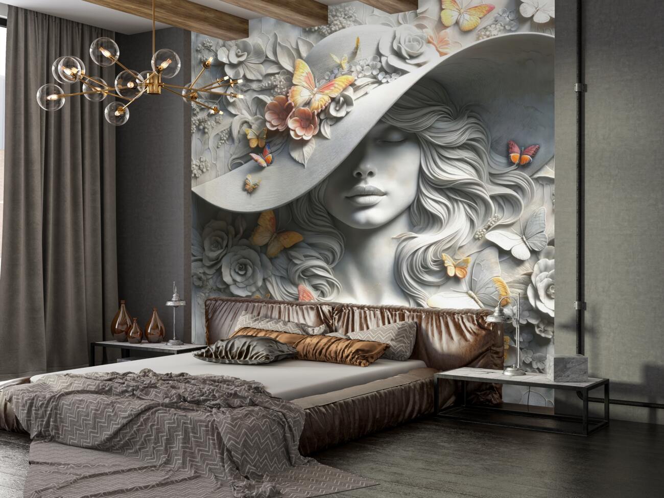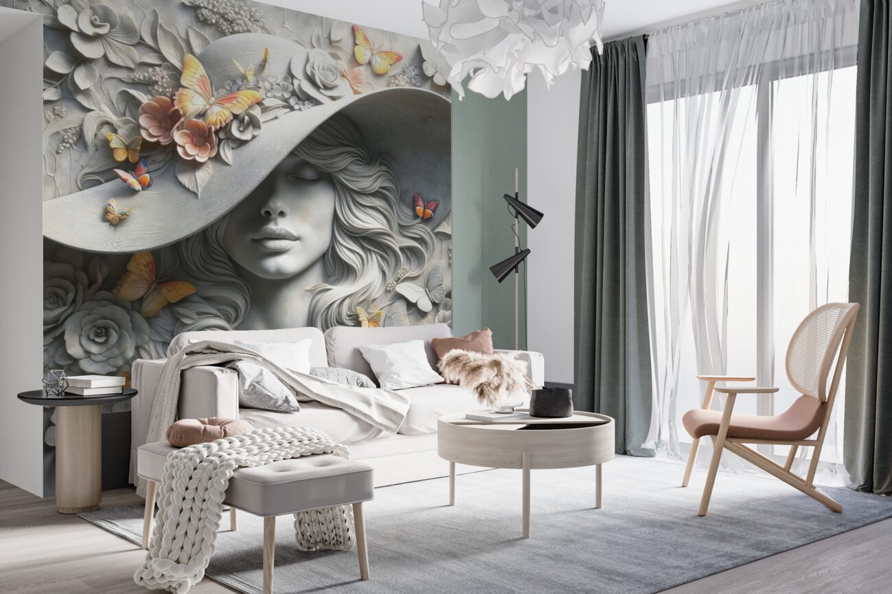 Tapeta Fototapeta Dziewczyna w okrągłym kapeluszu z motylami (artykuł a99540 ) z kategorii Fototapety 3D