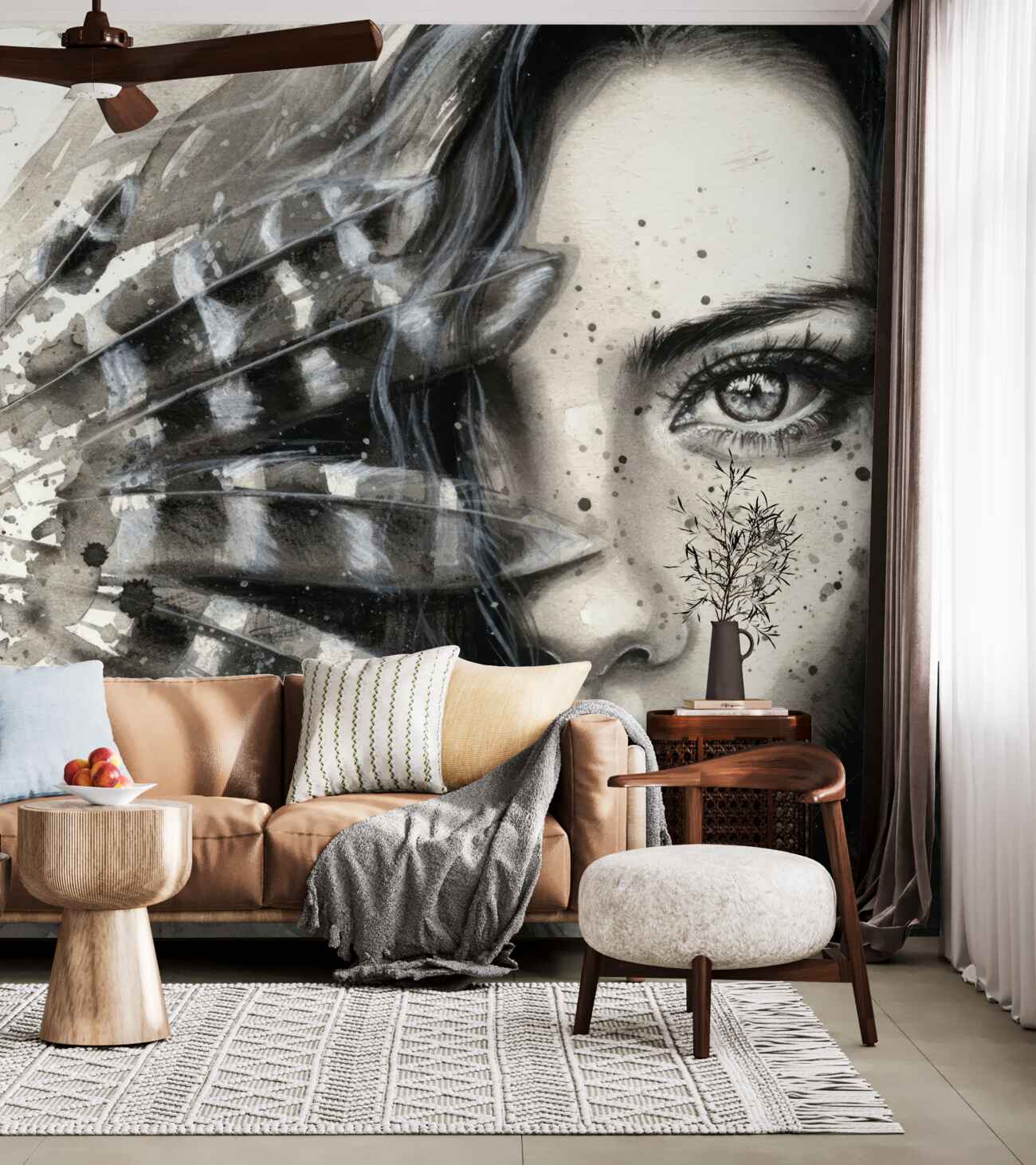 Tapeta Fototapeta Dziewczyna z abstrakcją piór (artykuł a99382 ) z kategorii Fototapety 3D