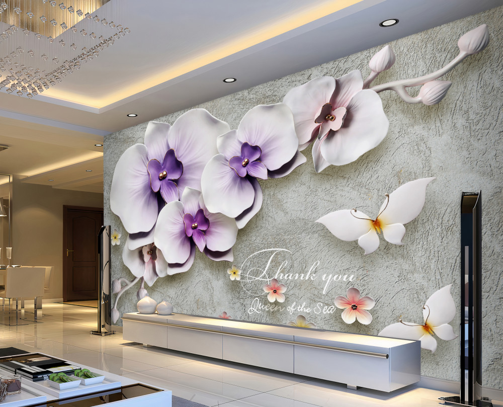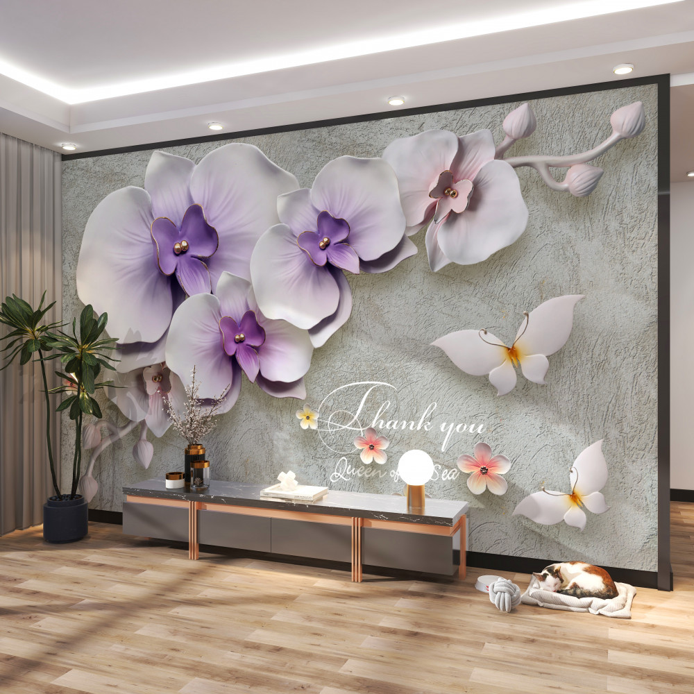 Tapeta Fototapeta fioletowe lilie i białe motyle (artykuł a90476 ) z kategorii Fototapety 3D