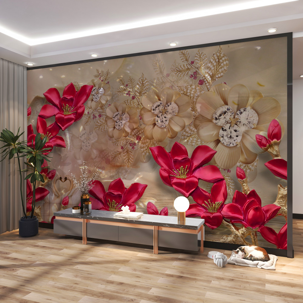 Tapeta Fototapeta gałęzie czerwonej linii ze złotem i perłami (artykuł a90940 ) z kategorii Fototapety 3D