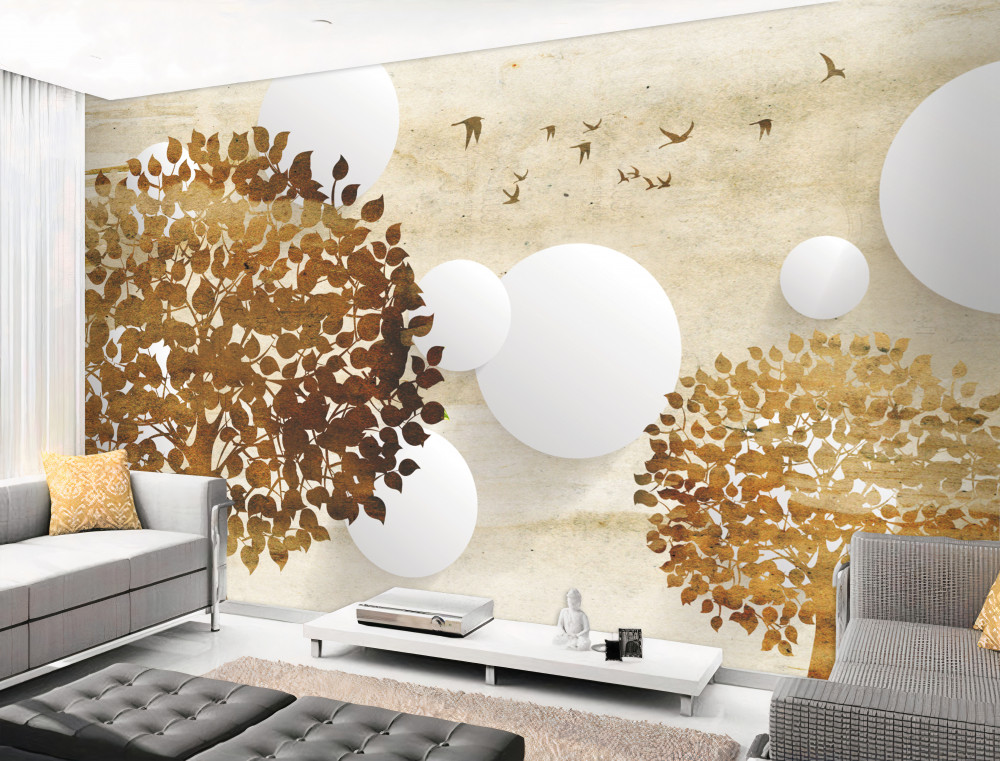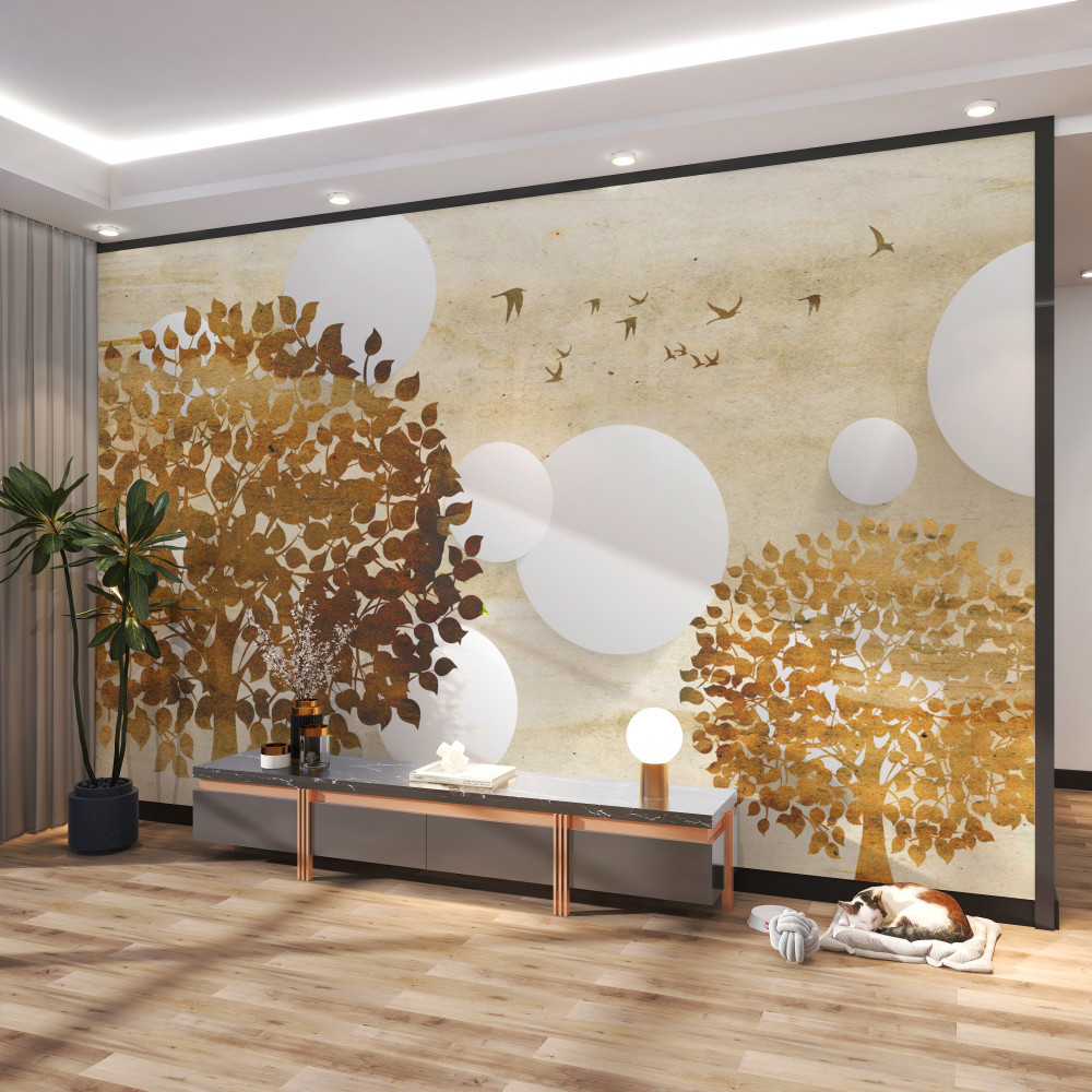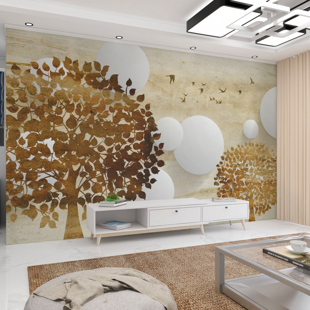 Tapeta Fototapeta jesienne drzewa o zachodzie słońca i białe kółka (artykuł pb2234 ) z kategorii Fototapety 3D