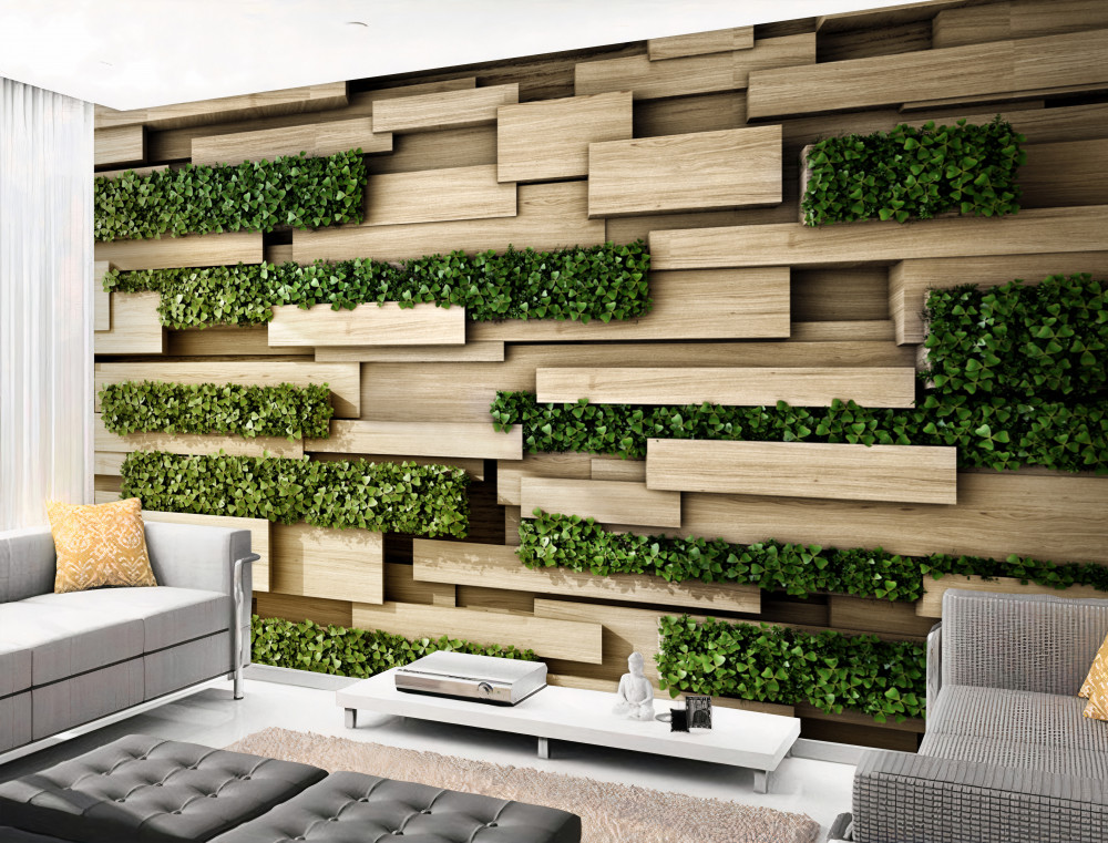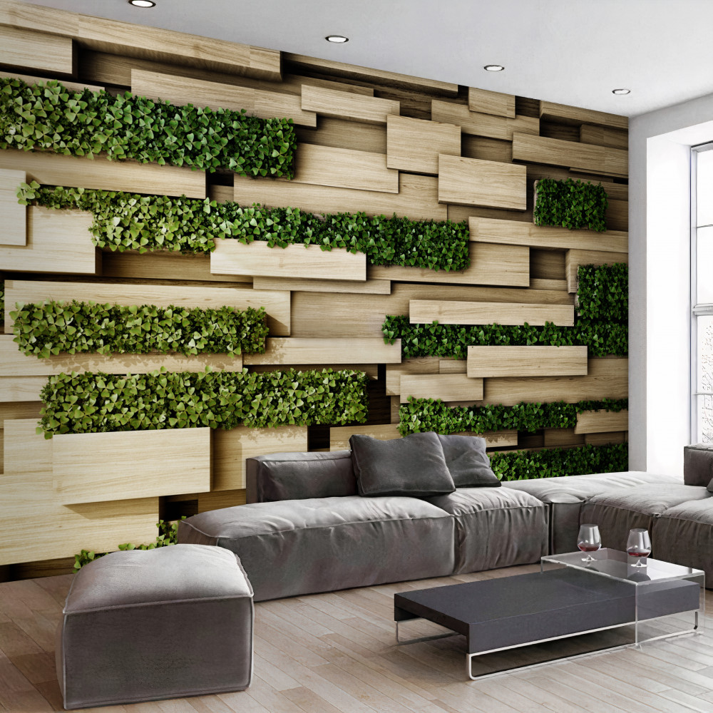 Tapeta Fototapeta kamienny mur z zielonymi roślinami (artykuł a91234 ) z kategorii Fototapety 3D