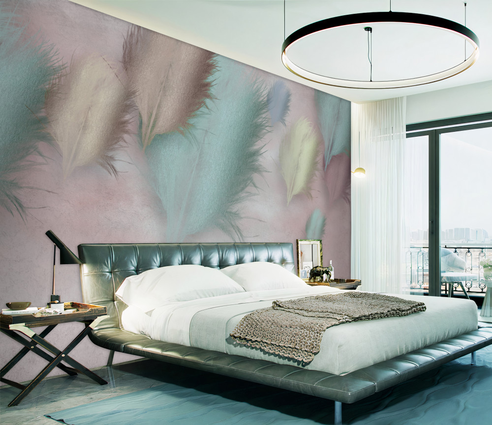 Tapeta Fototapeta kolorowe latające pióra na różowym niebie (artykuł a94246 ) z kategorii Fototapety 3D