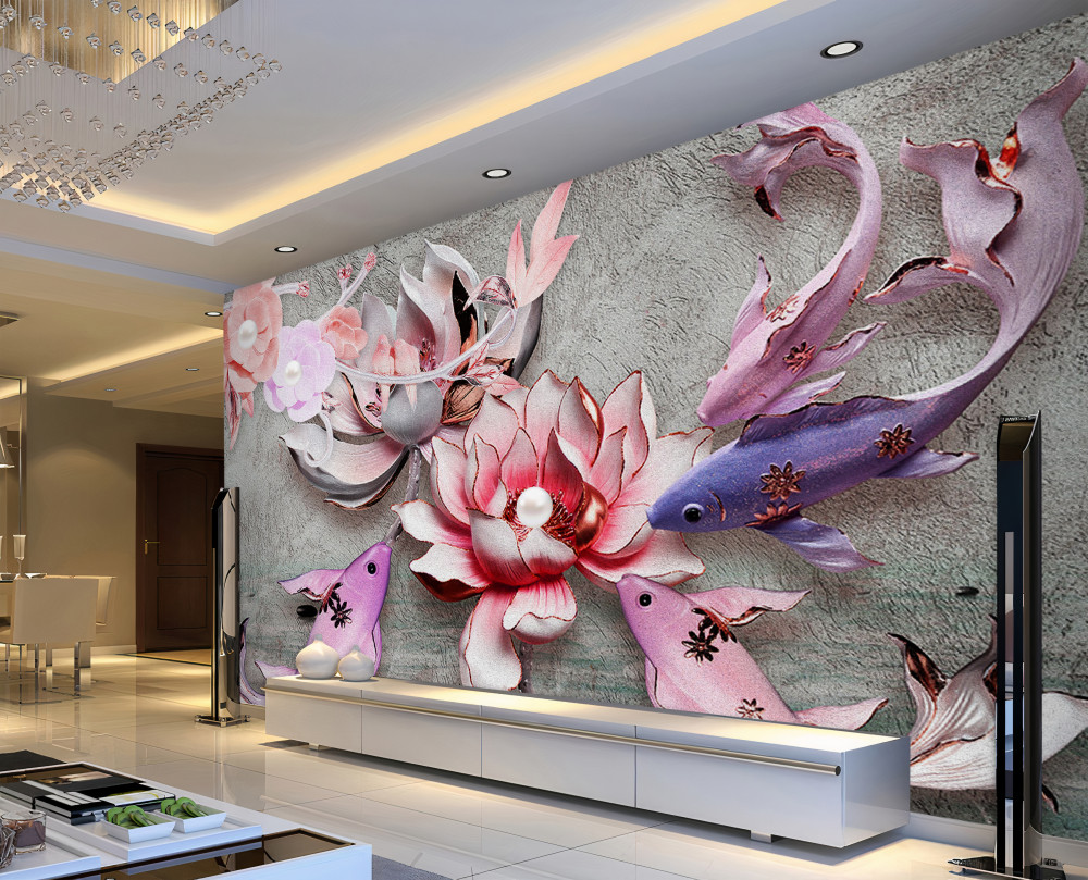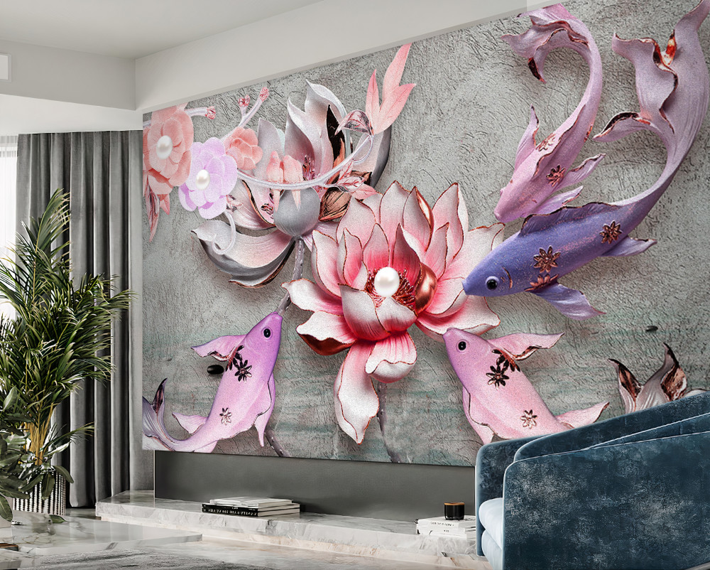 Tapeta Fototapeta kompozycja kwiatów lotosu z rybami w jeziorze (artykuł pb8936 ) z kategorii Fototapety 3D