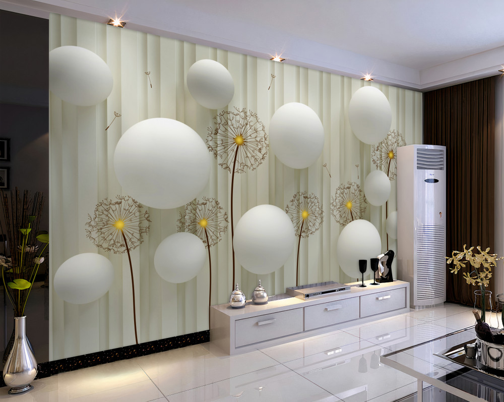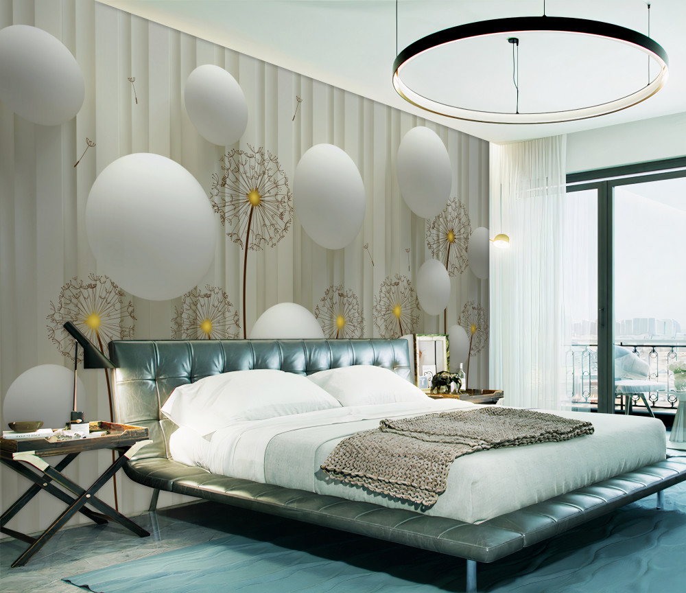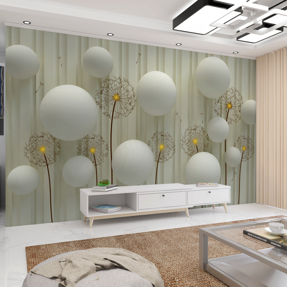 Tapeta Fototapeta kompozycja kwitnącego mniszka lekarskiego i białych kulek (artykuł a89927 ) z kategorii Fototapety 3D