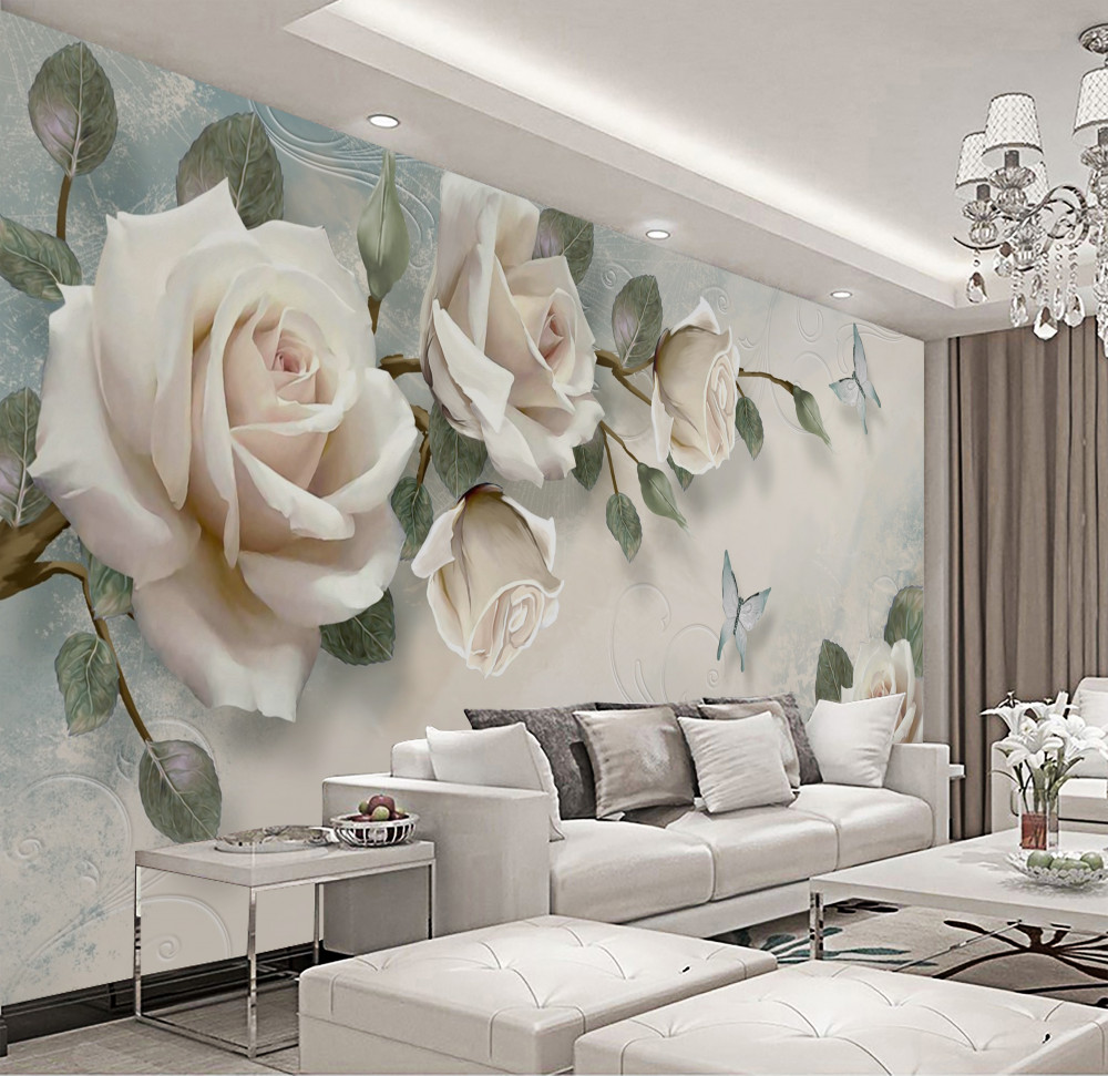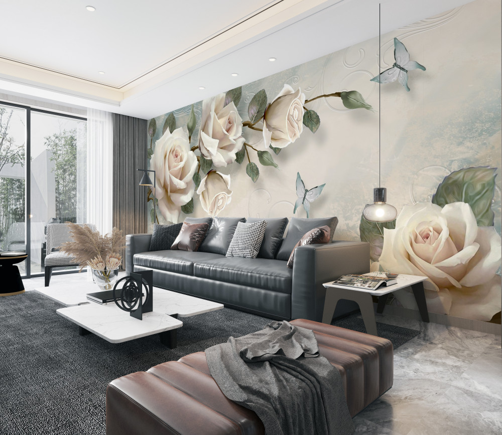 Tapeta Fototapeta kremowe gałązki róż i latające motyle (artykuł a93529 ) z kategorii Fototapety 3D