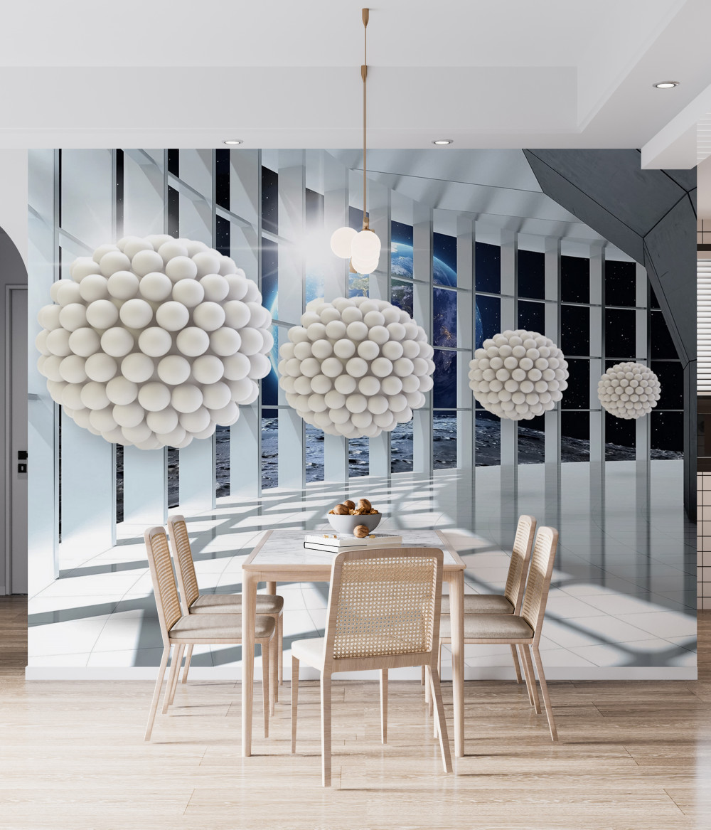 Tapeta Fototapeta kule balonowe unoszące się w nocnym korytarzu (artykuł a93470 ) z kategorii Fototapety 3D