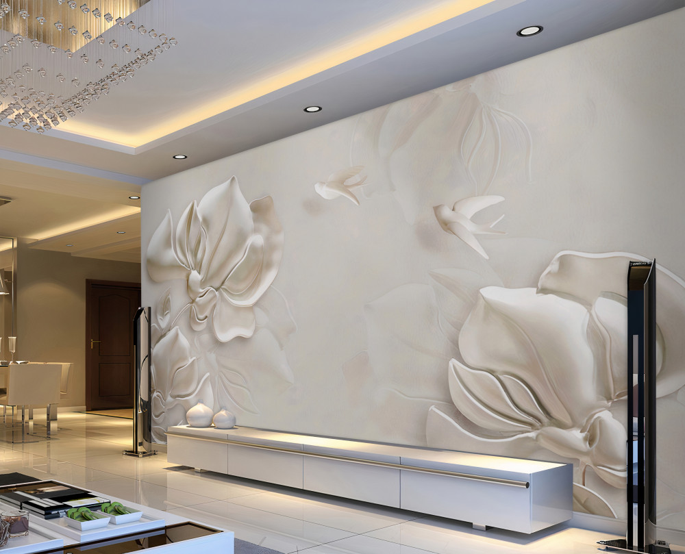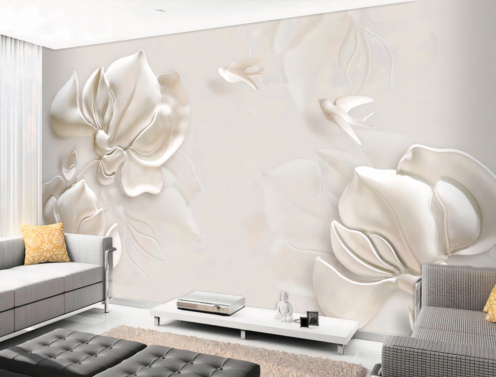 Tapeta Fototapeta kwiaty i ptaki z białej tkaniny (artykuł a93773 ) z kategorii Fototapety 3D