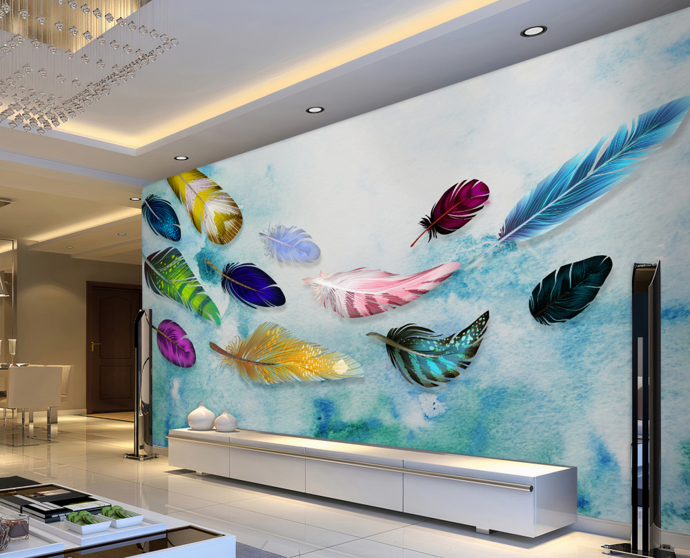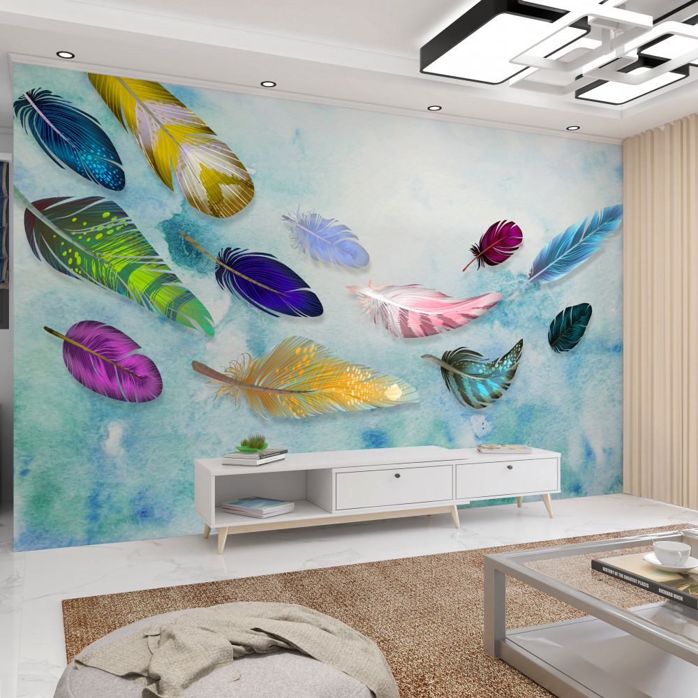 Tapeta Fototapeta latające pióra o różnych kształtach i kolorach (artykuł a92518 ) z kategorii Fototapety 3D