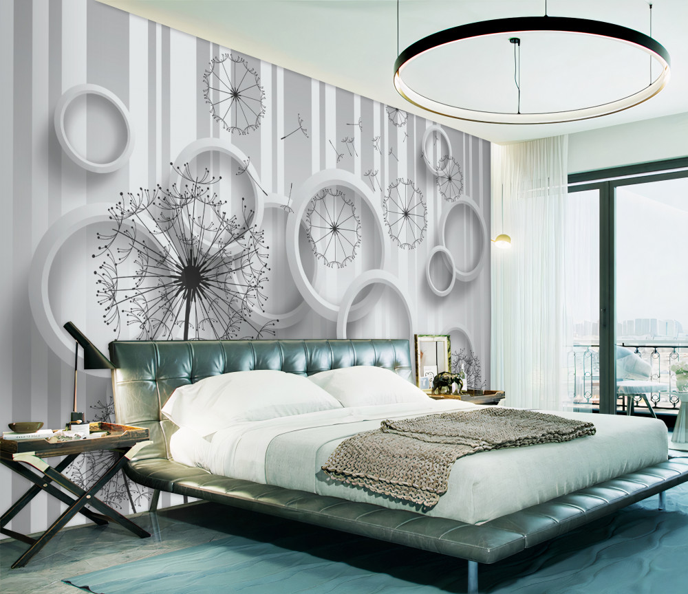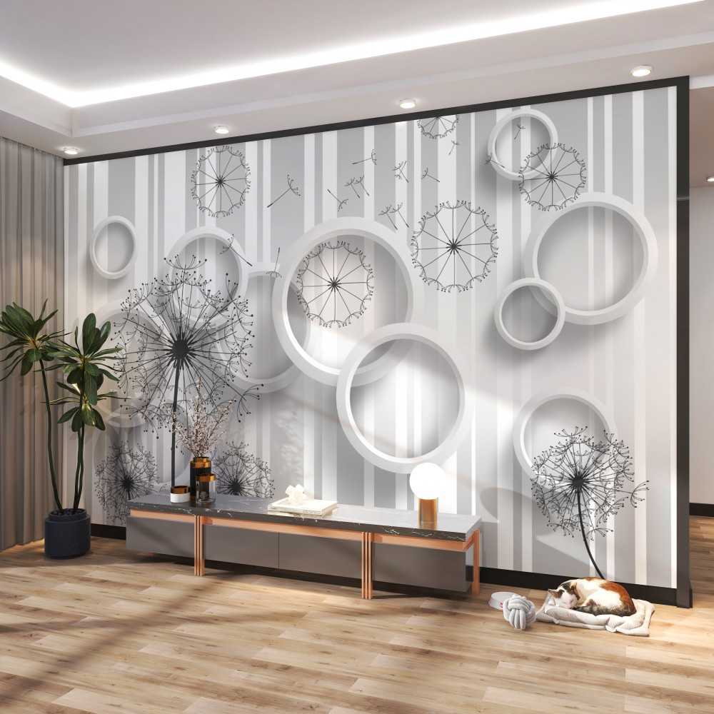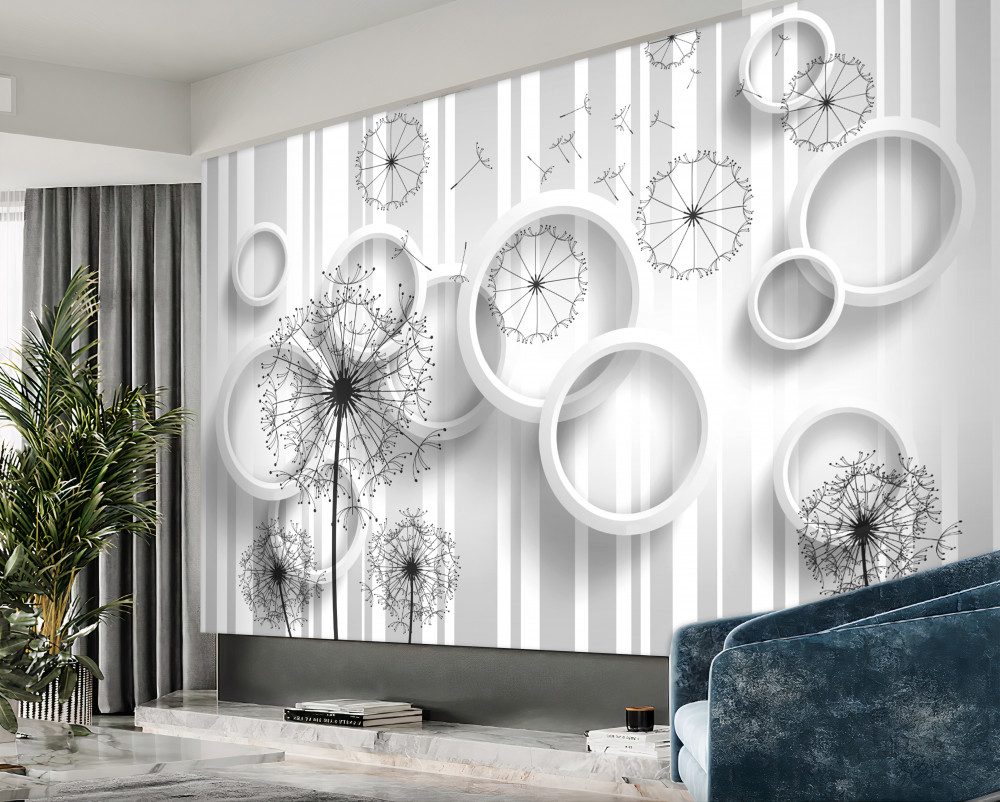 Tapeta Fototapeta mniszek lekarski i białe kółka na szarym tle (artykuł pb5566 ) z kategorii Fototapety 3D