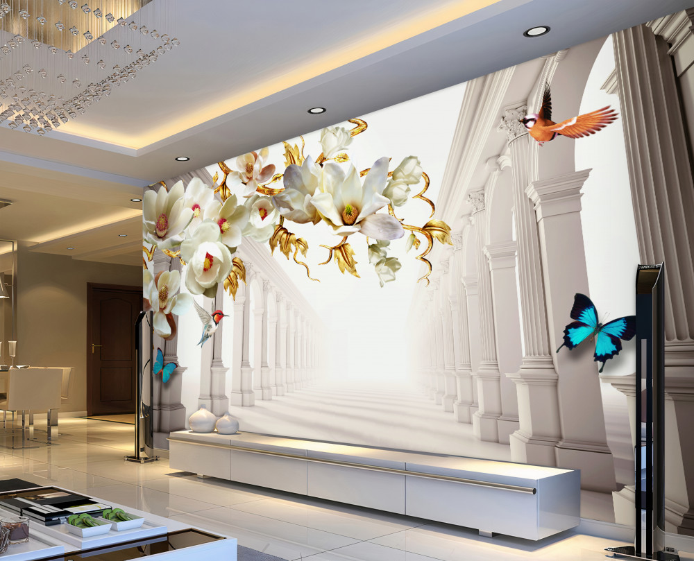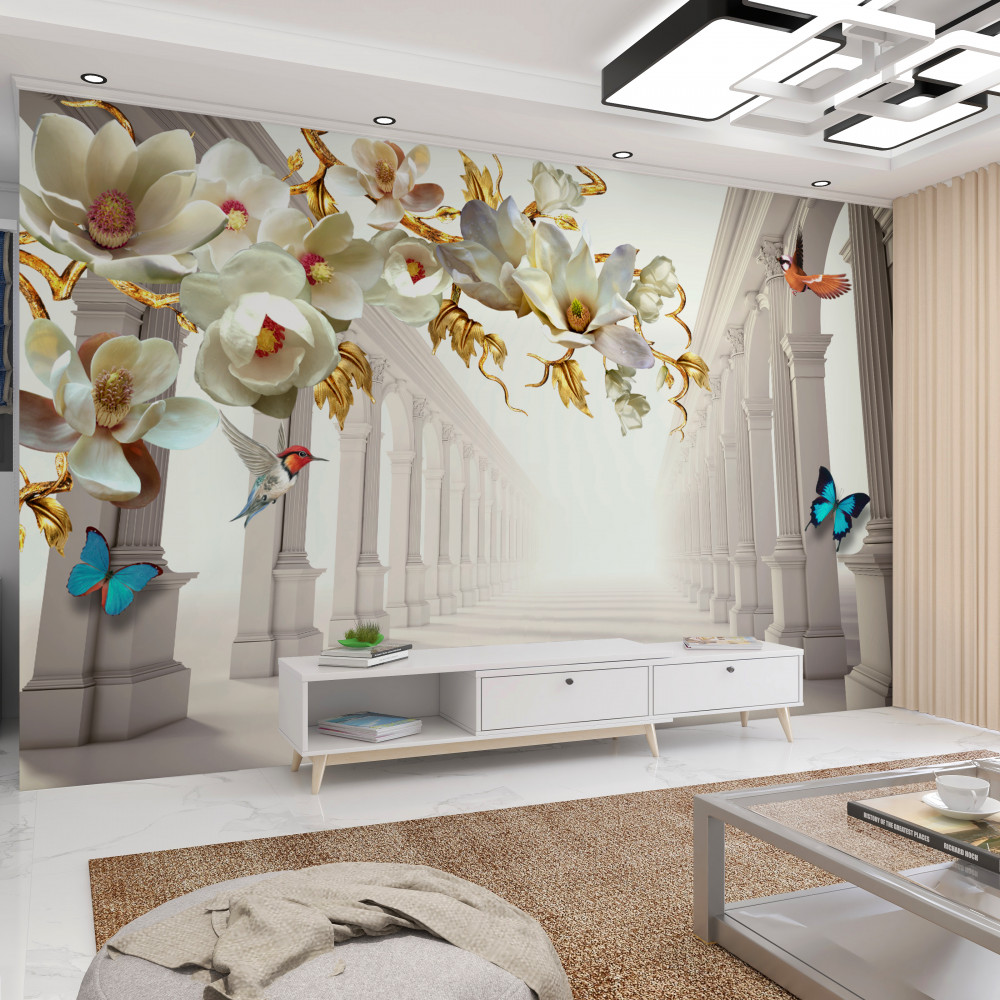 Tapeta Fototapeta motyle i białe kwiaty ze złotymi liśćmi w łukach (artykuł a91210 ) z kategorii Fototapety 3D