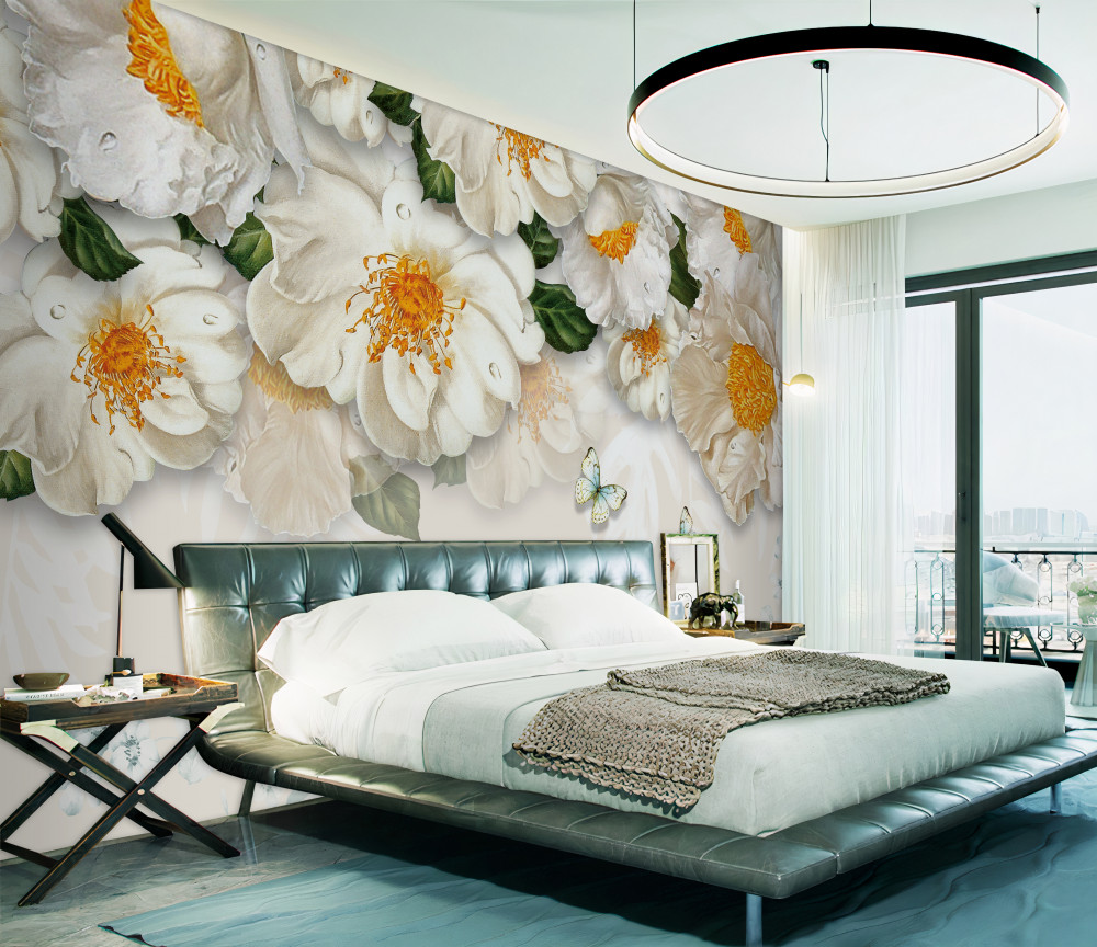 Tapeta Fototapeta motyle latają do białych kwiatów (artykuł a90007 ) z kategorii Fototapety 3D