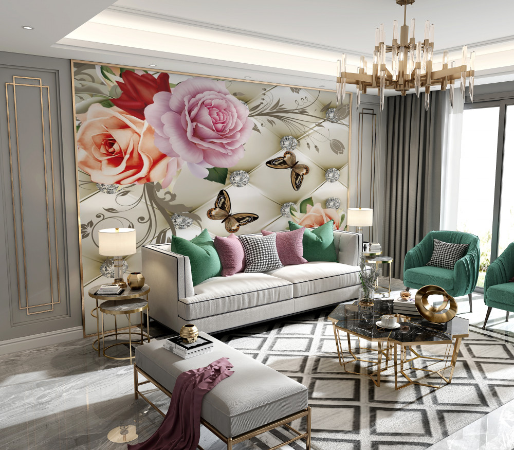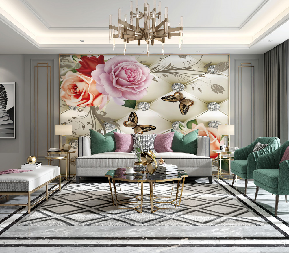 Tapeta Fototapeta motyle na pąkach róż jasne z perłami (artykuł a93585 ) z kategorii Fototapety 3D