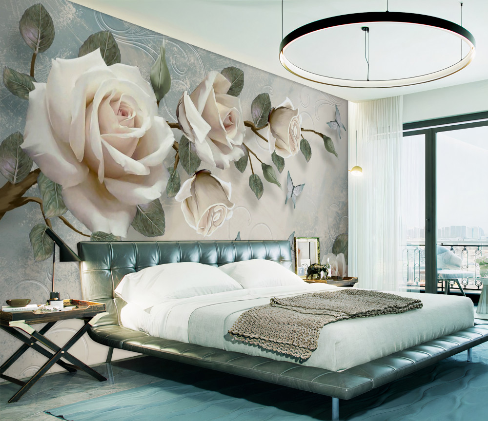 Tapeta Fototapeta motyle nad kwitnącymi kremowymi różami (artykuł a93548 ) z kategorii Fototapety 3D