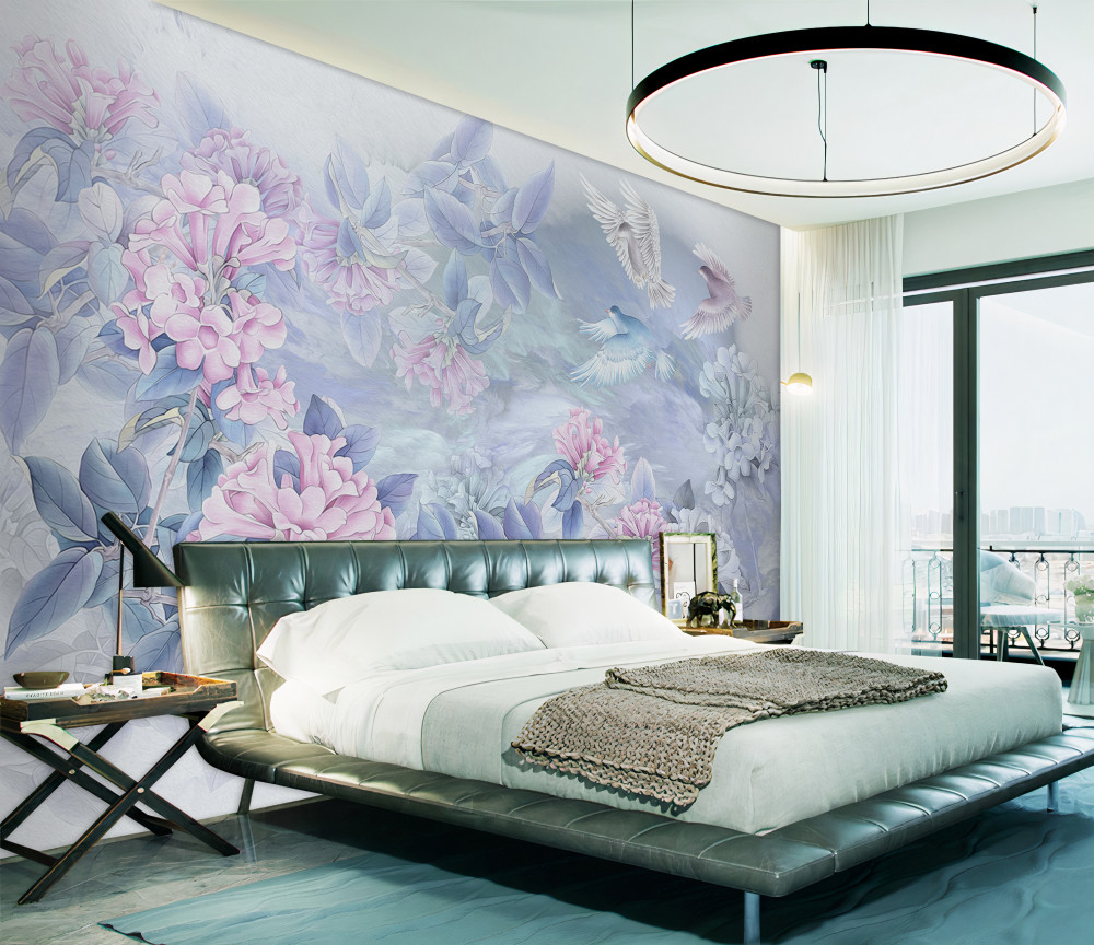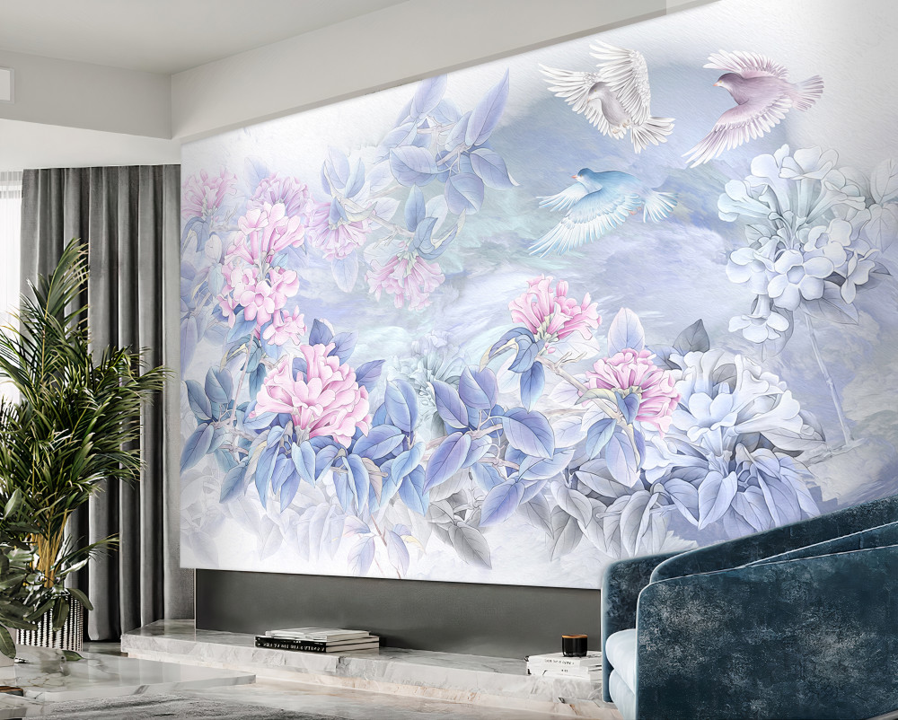 Tapeta Fototapeta niebieskie gałęzie z kwitnącymi różowymi kwiatami (artykuł a93324 ) z kategorii Fototapety 3D
