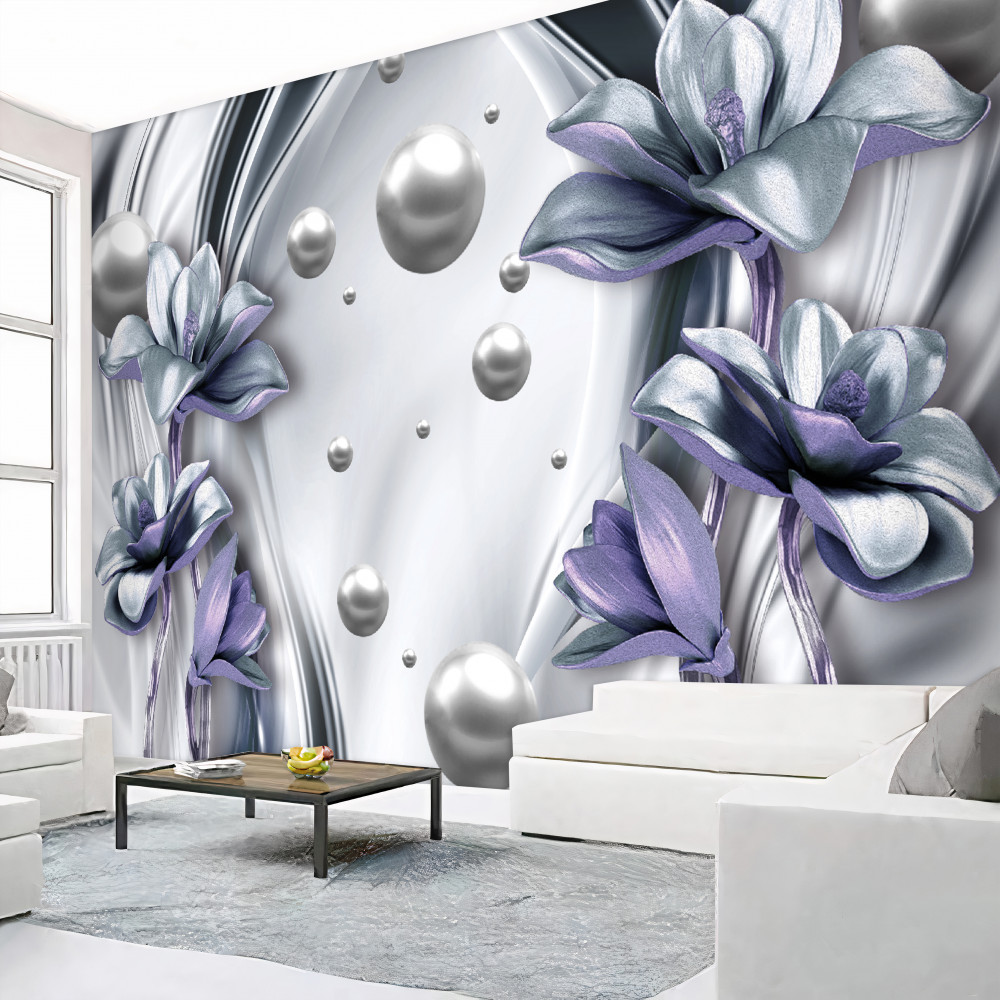 Tapeta Fototapeta niebieskie kwiaty i perły na jedwabiu (artykuł pb10015 ) z kategorii Fototapety 3D