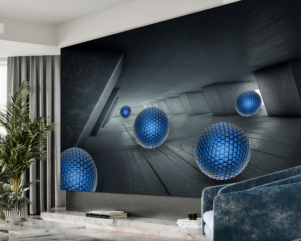 Tapeta Fototapeta niekończący się szary korytarz i niebieskie kule (artykuł a93471 ) z kategorii Fototapety 3D