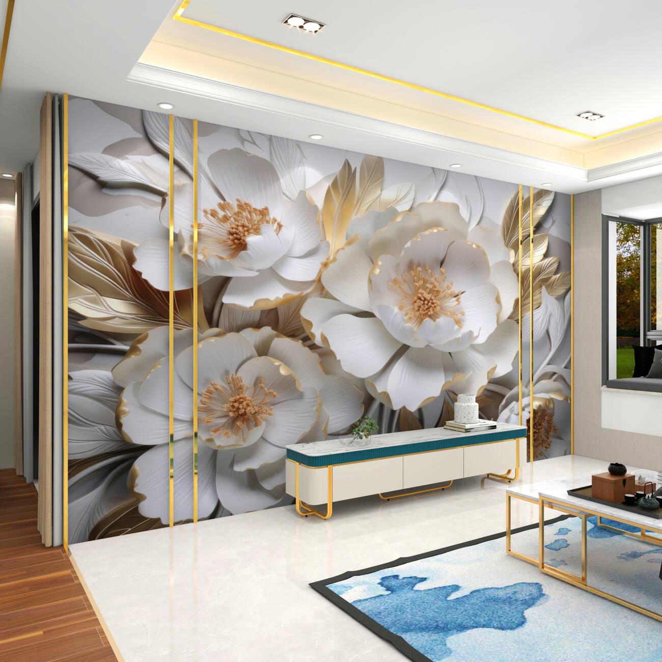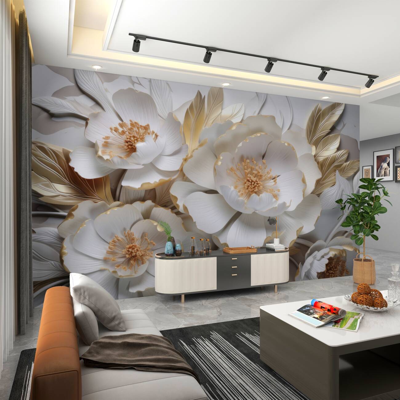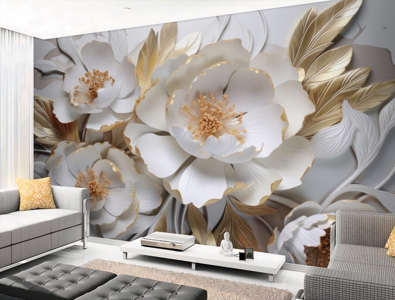 Tapeta Fototapeta Objętość białe kwiaty ze złotem (artykuł u10963 ) z kategorii Fototapety 3D