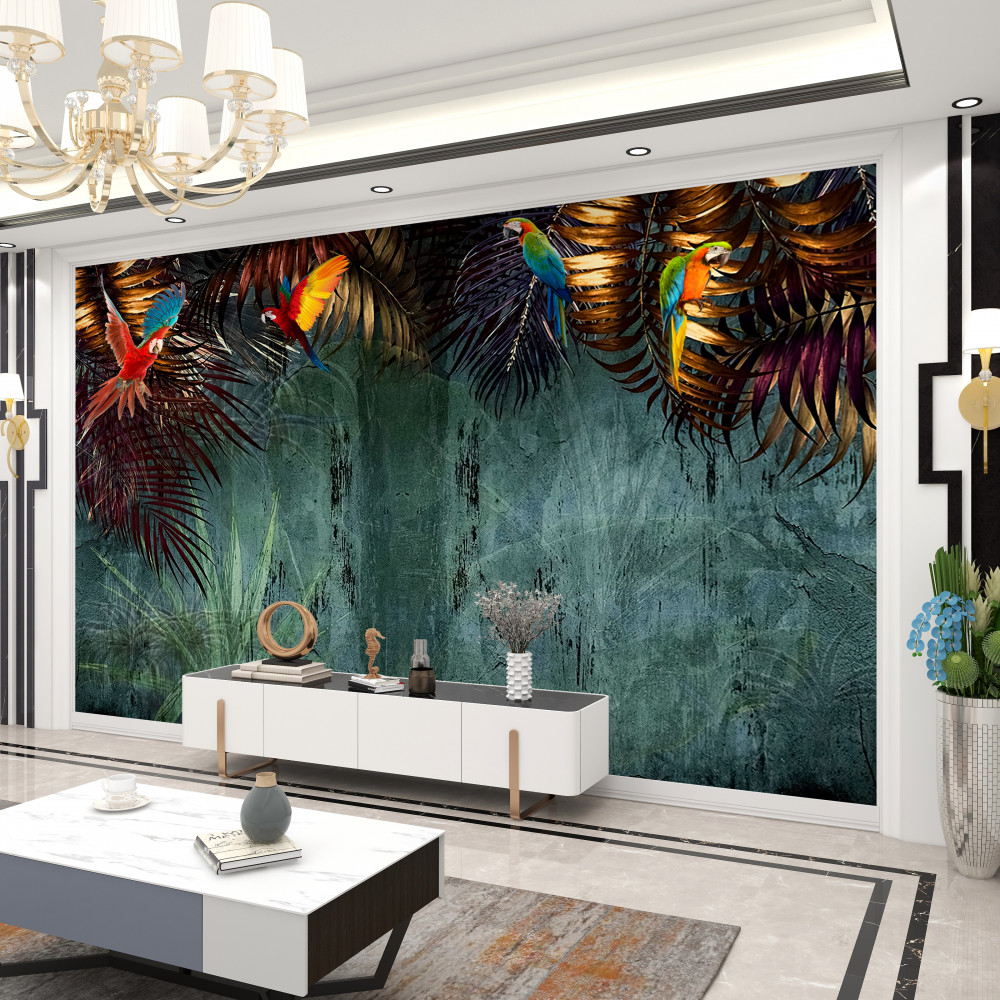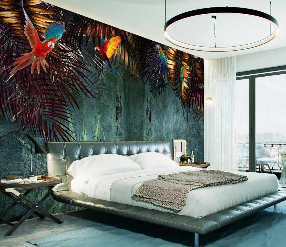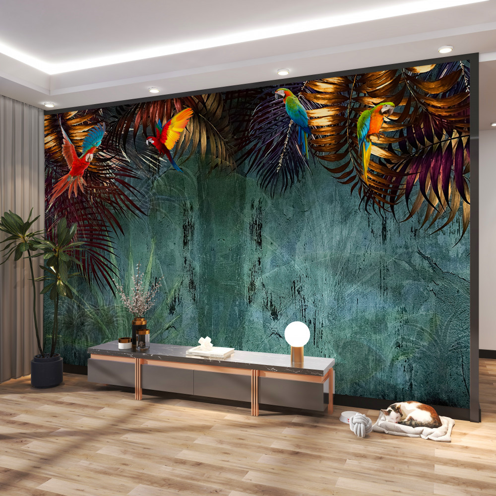 Tapeta Fototapeta papugi na tropikalnych liściach wieczorem (artykuł a92811 ) z kategorii Fototapety 3D