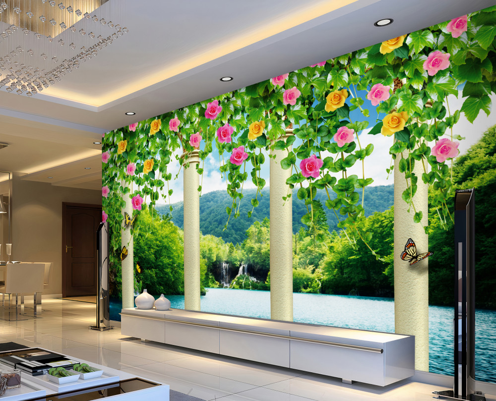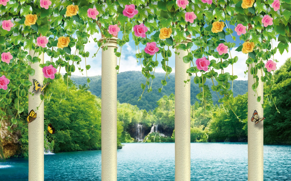 Tapeta Fototapeta piękny widok przez kwiaty wodospadu (artykuł a91883 ) z kategorii Fototapety 3D