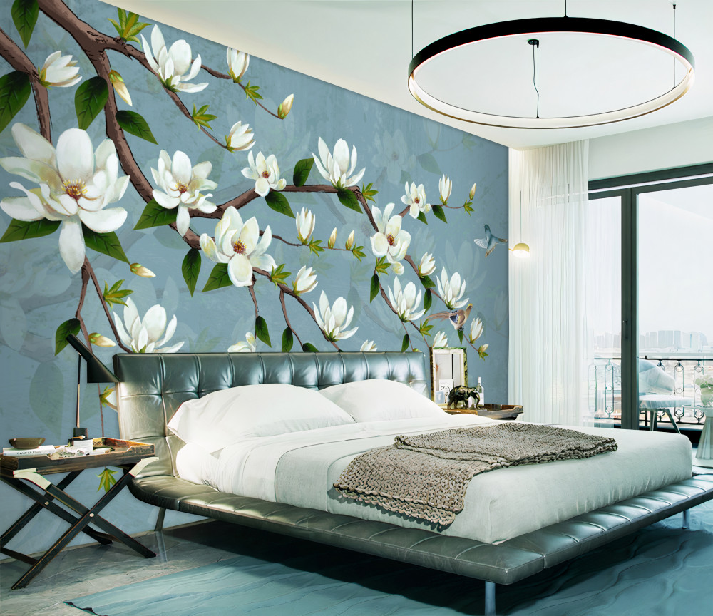 Tapeta Fototapeta ptak leci do białych kwiatów (artykuł a92024 ) z kategorii Fototapety 3D