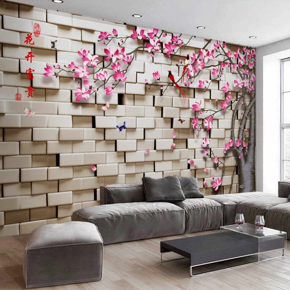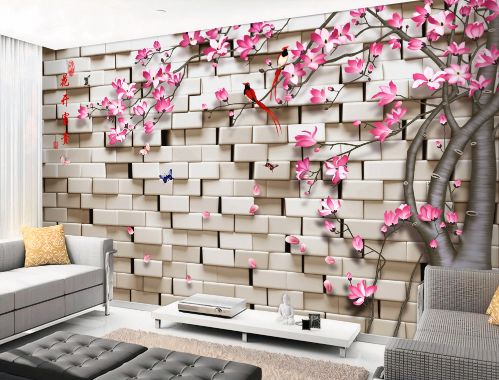 Tapeta Fototapeta różowe kwiaty i kamienny mur (artykuł a91886 ) z kategorii Fototapety 3D