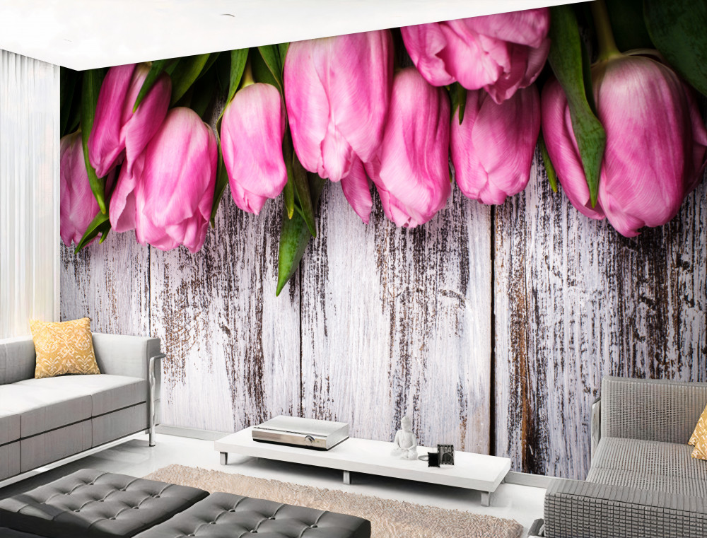 Tapeta Fototapeta różowe tulipany na podłoże drewniane (artykuł a88462 ) z kategorii Fototapety 3D
